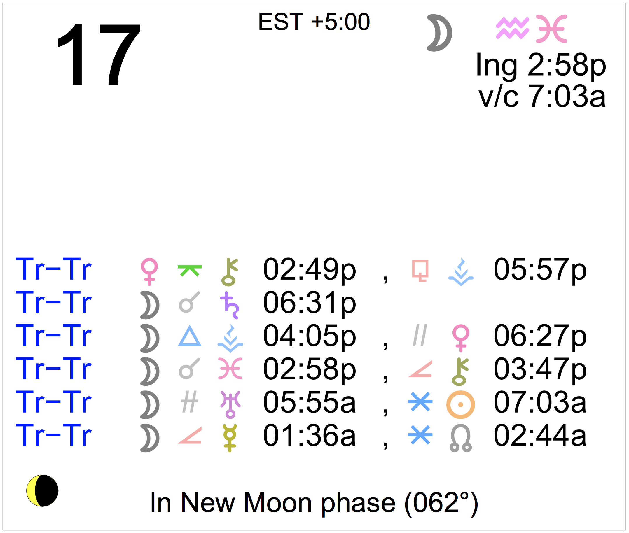 - The Moon is in Aquarius until 2:58 PM, after which the Moon is in Pisces.
