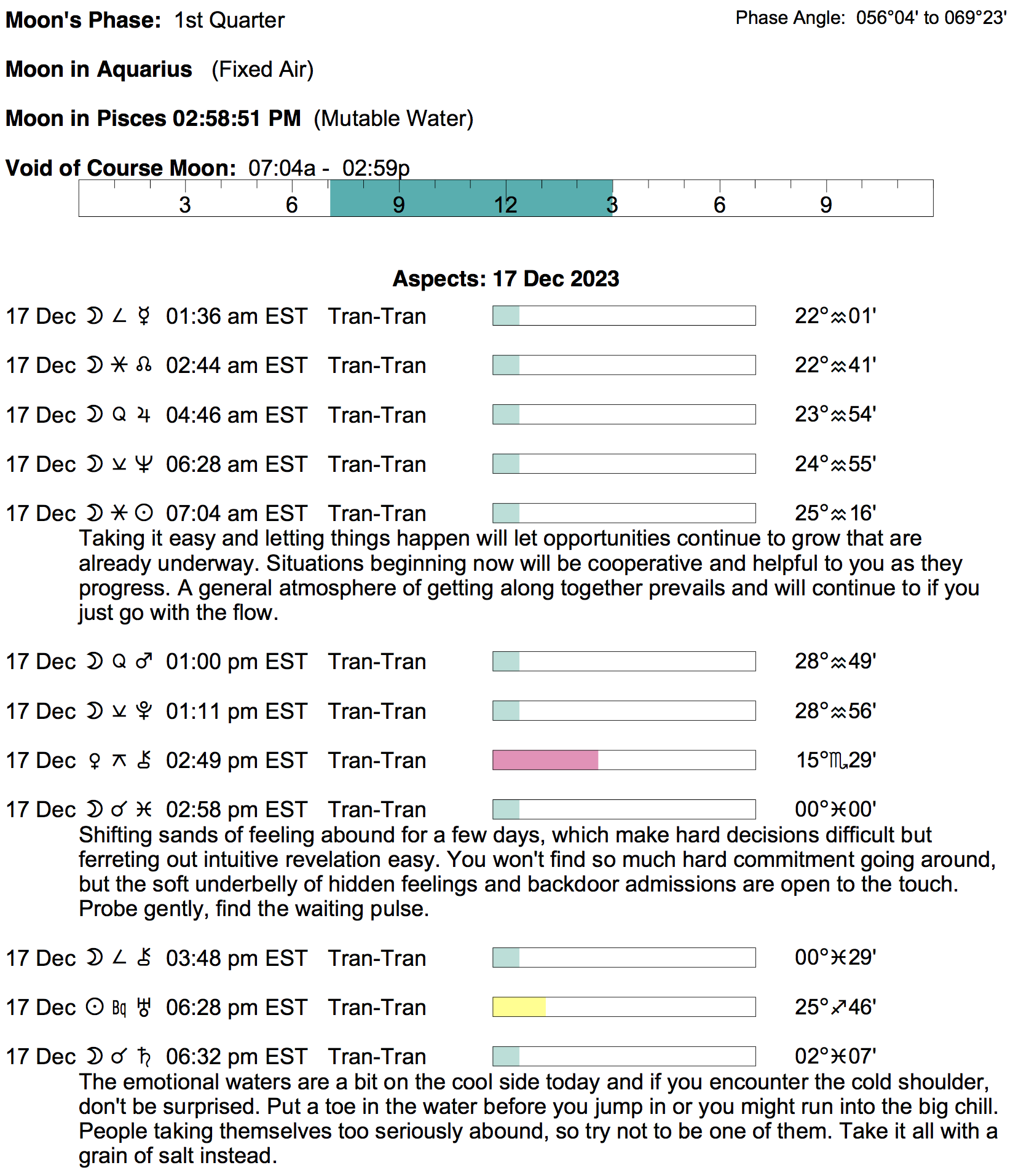 Planet Color Key: The longer the bar, the slower the aspecting planet, and the longer the duration of the planet’s transit.