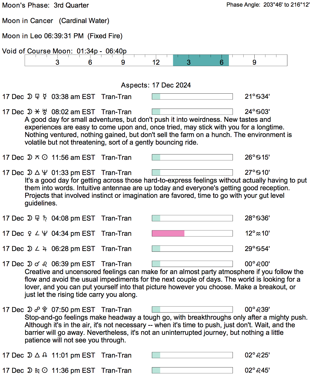 Planet Color Key: The longer the bar, the slower the aspecting planet, and the longer the duration of the planet’s transit.