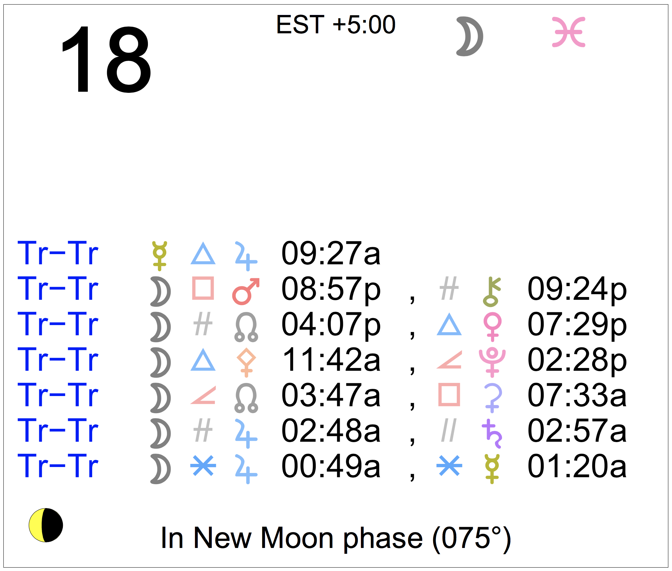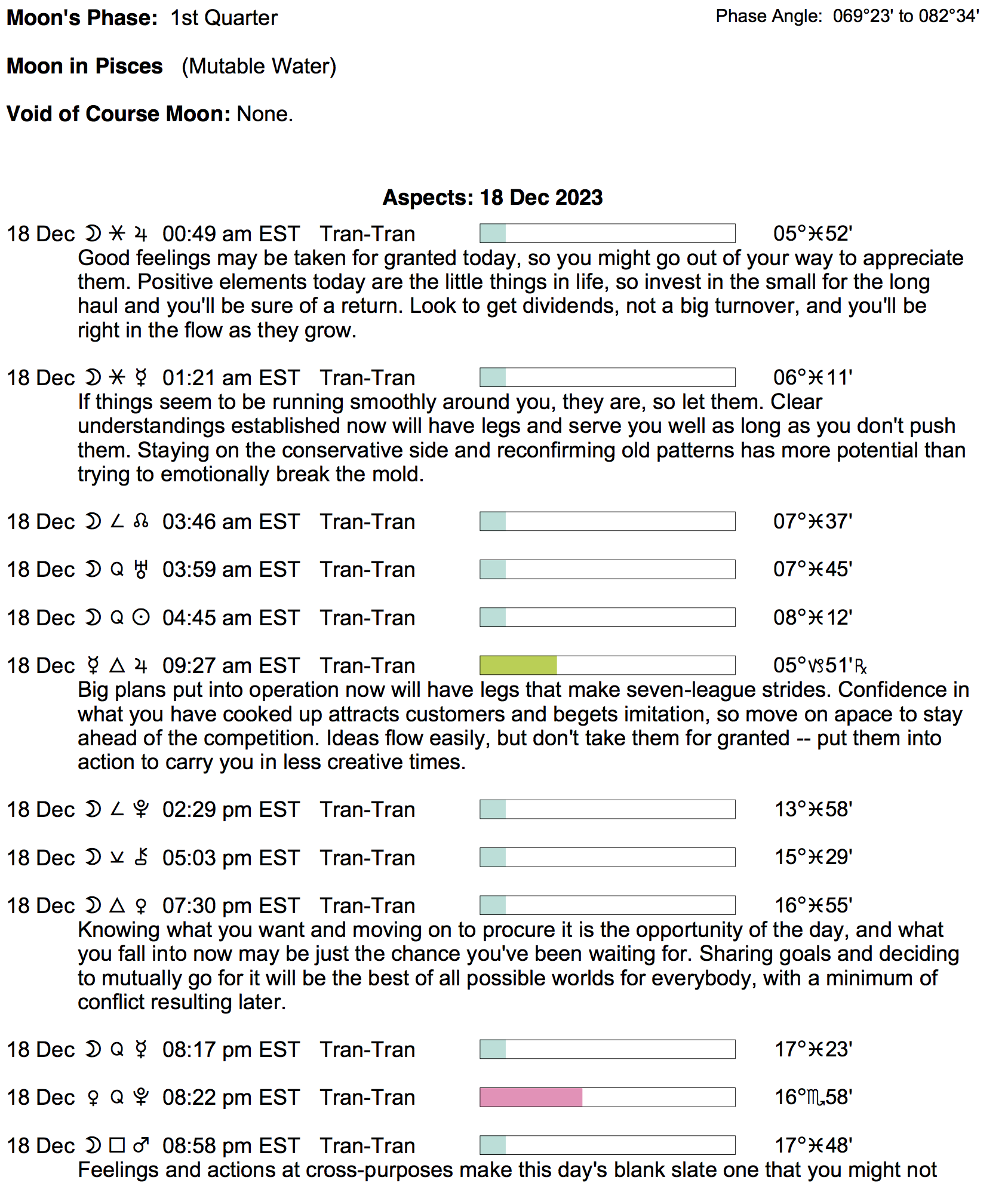 Planet Color Key: The longer the bar, the slower the aspecting planet, and the longer the duration of the planet’s transit.