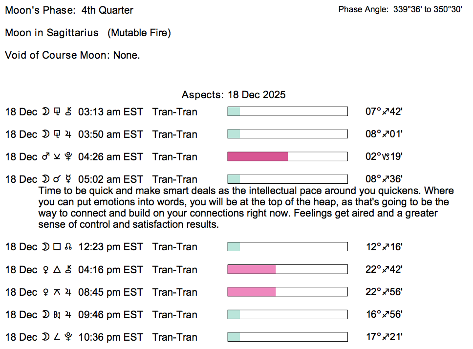 - The Last Quarter Moon occurred on the 11th, and the New Moon will occur tomorrow in the sign of Sagittarius.