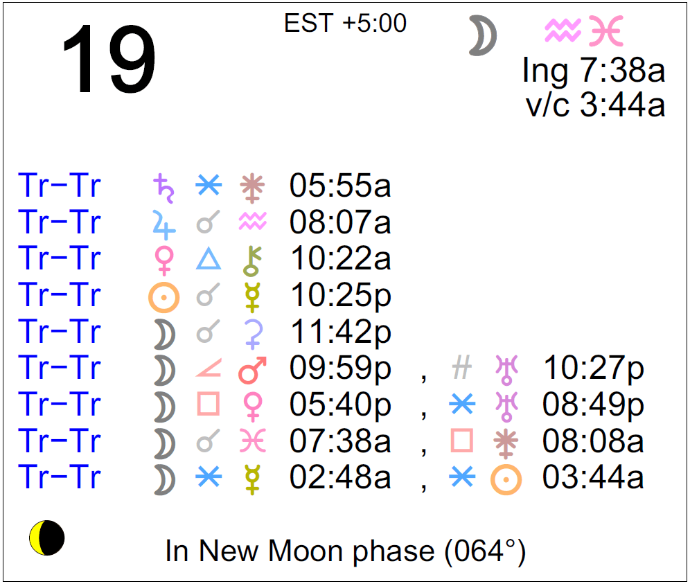Planet Color Key: The longer the bar, the slower the aspecting planet, and the longer the duration of the planet’s transit.