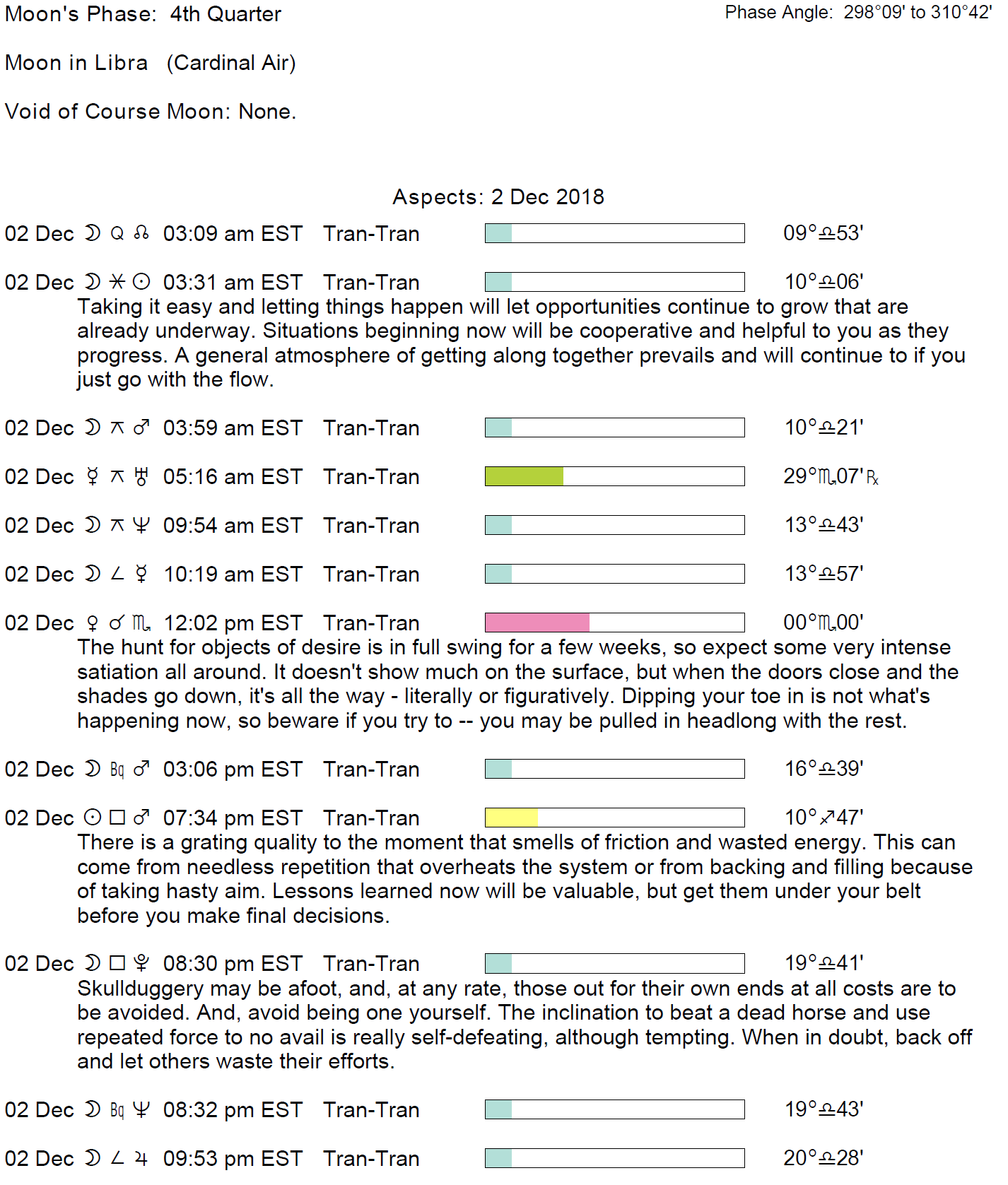 Planet Color Key: The longer the bar, the slower the aspecting planet and the longer the duration of the planet’s transit.