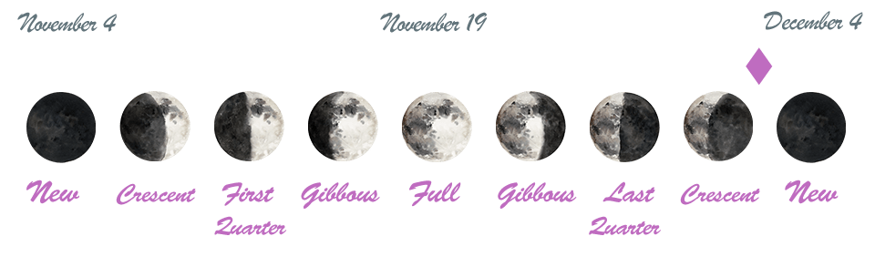 - The Third Quarter Moon occurred on the 27th, and the New Moon Solar Eclipse will occur on December 4th.