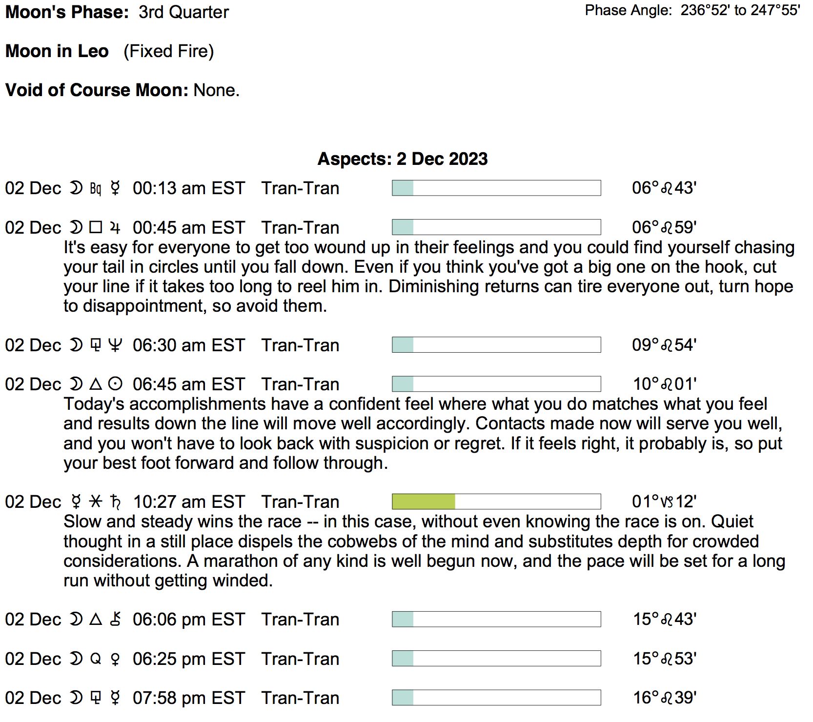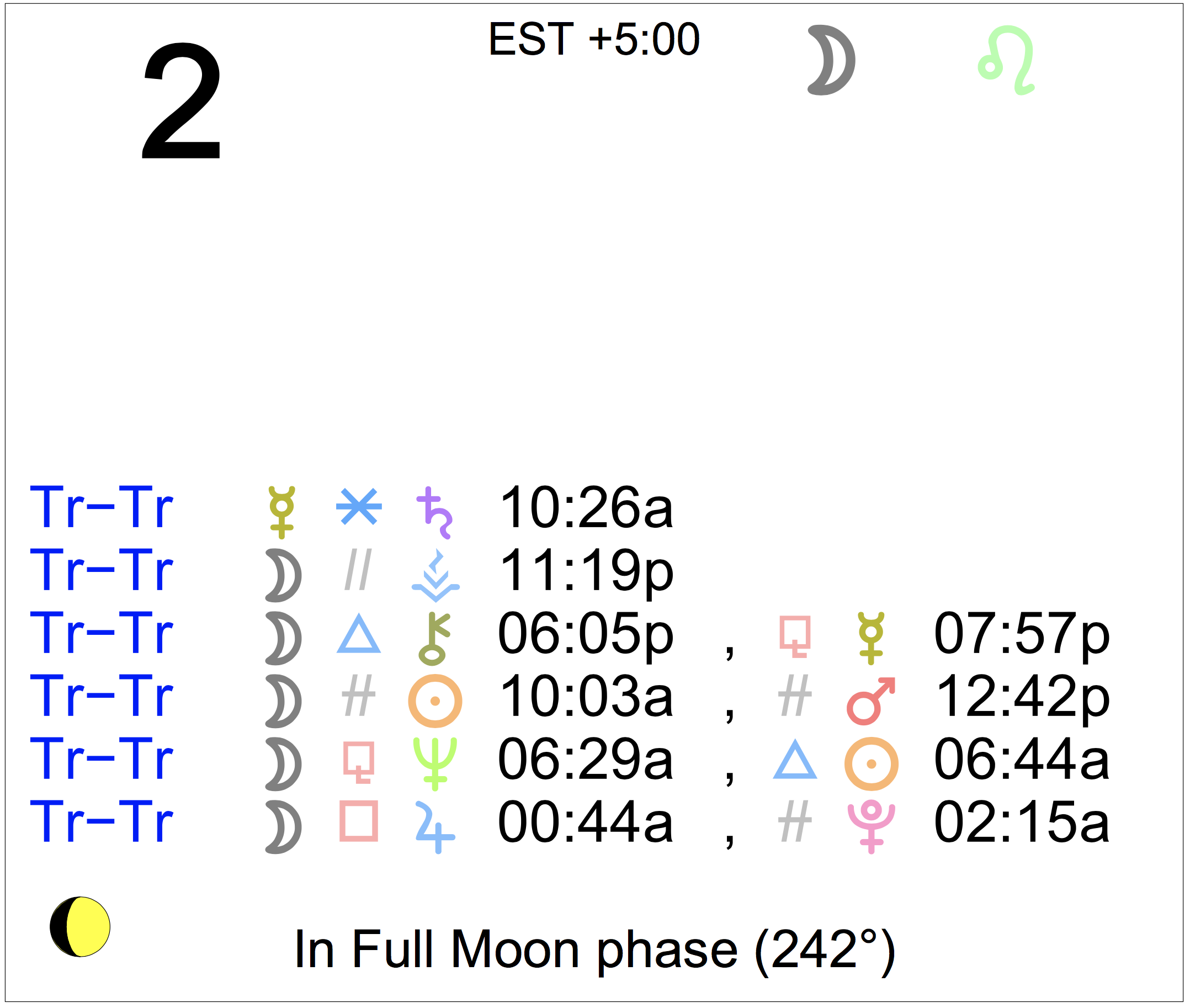 Planet Color Key: The longer the bar, the slower the aspecting planet, and the longer the duration of the planet’s transit.