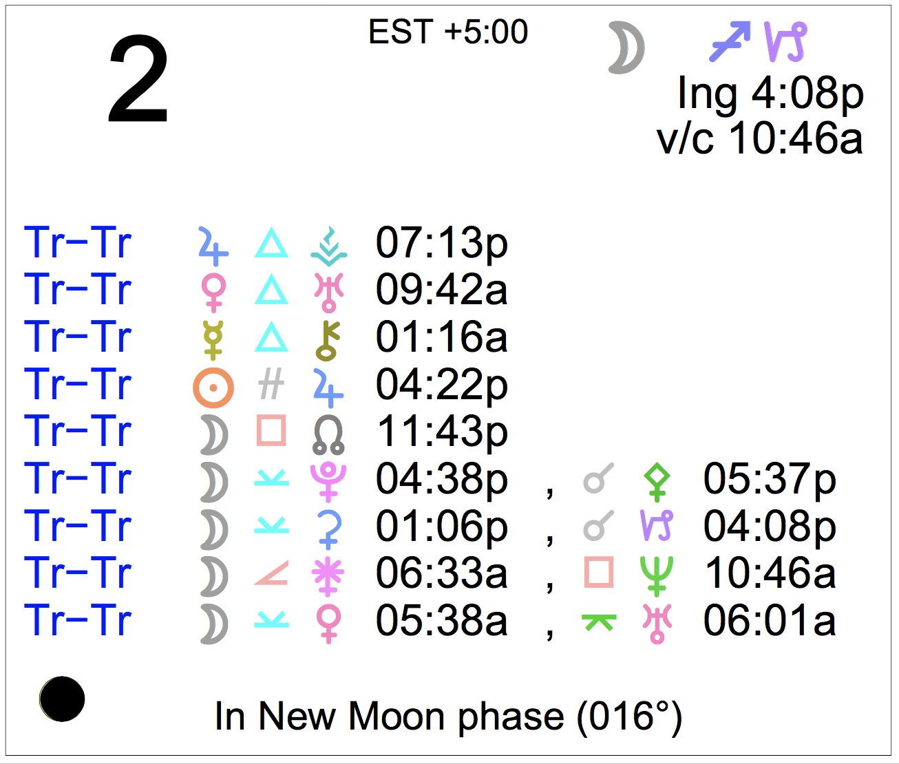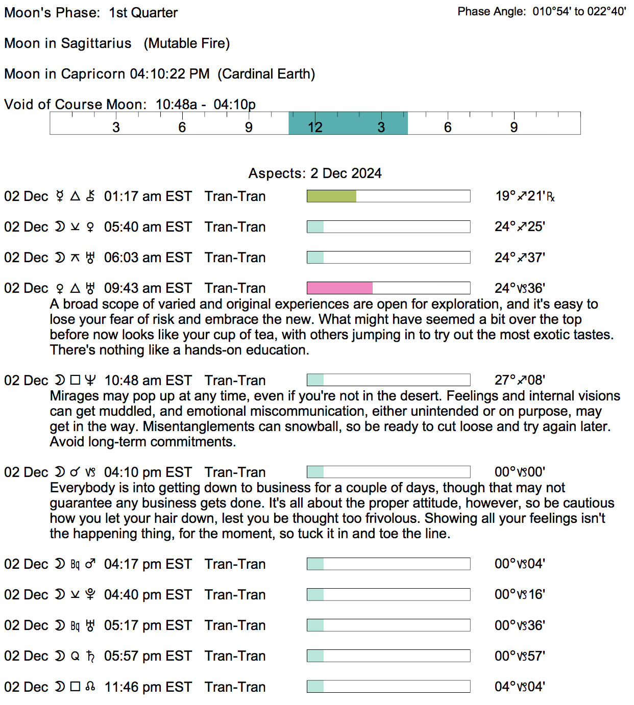 Planet Color Key: The longer the bar, the slower the aspecting planet, and the longer the duration of the planet’s transit.