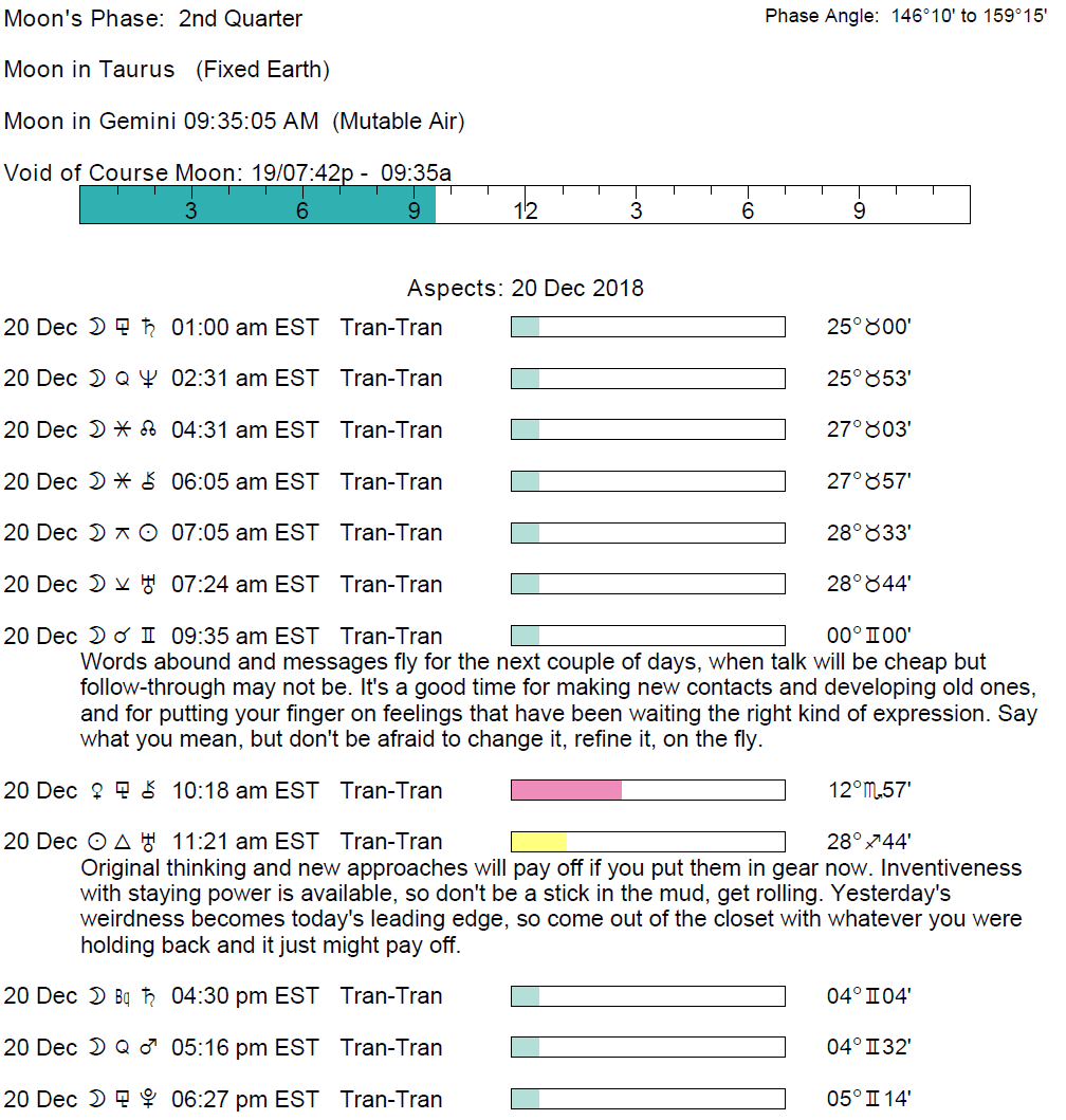 Planet Color Key: The longer the bar, the slower the aspecting planet and the longer the duration of the planet’s transit.