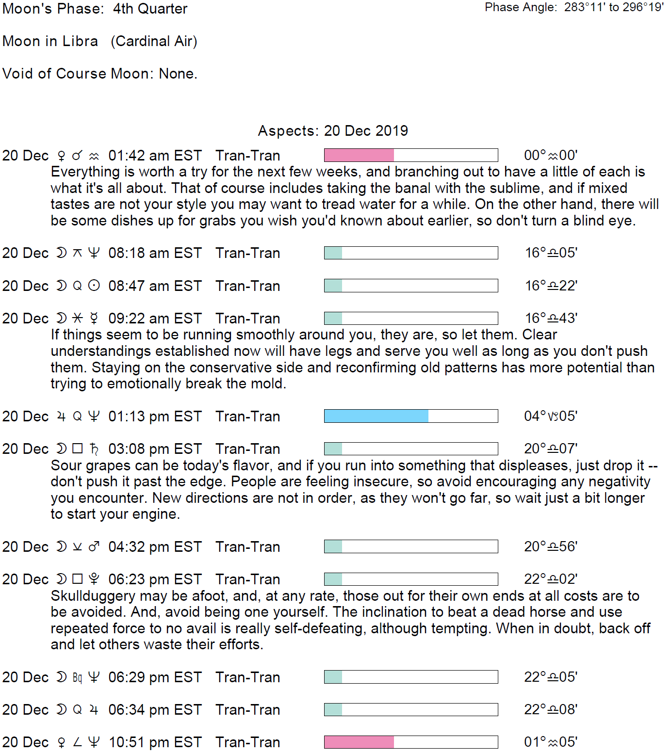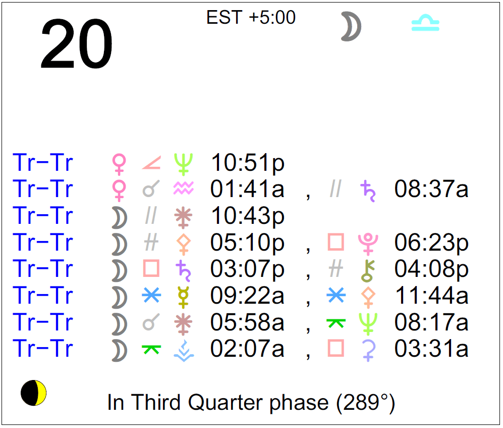 Planet Color Key: The longer the bar, the slower the aspecting planet and the longer the duration of the planet’s transit.