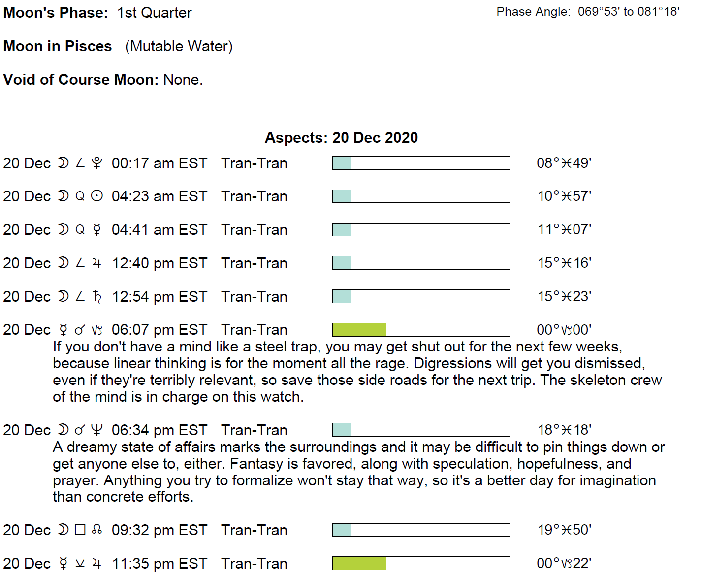 Planet Color Key: The longer the bar, the slower the aspecting planet, and the longer the duration of the planet’s transit.