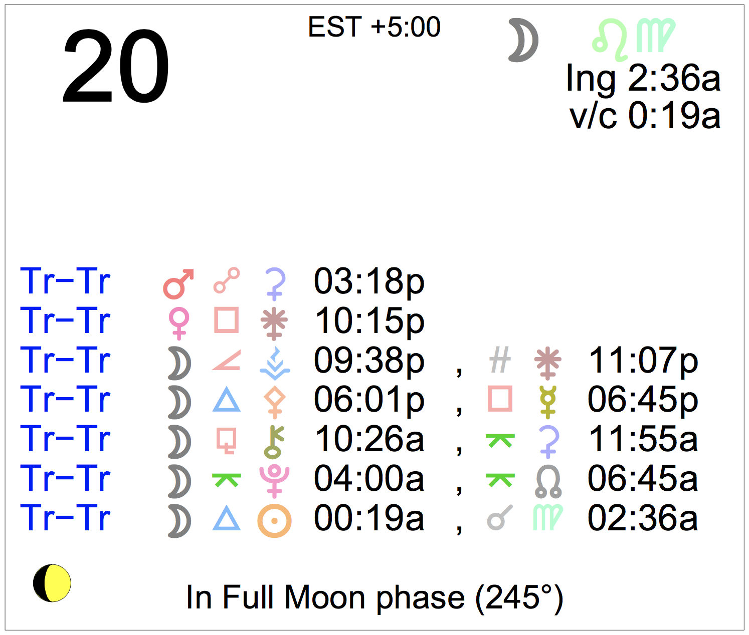 Planet Color Key: The longer the bar, the slower the aspecting planet, and the longer the duration of the planet’s transit.
