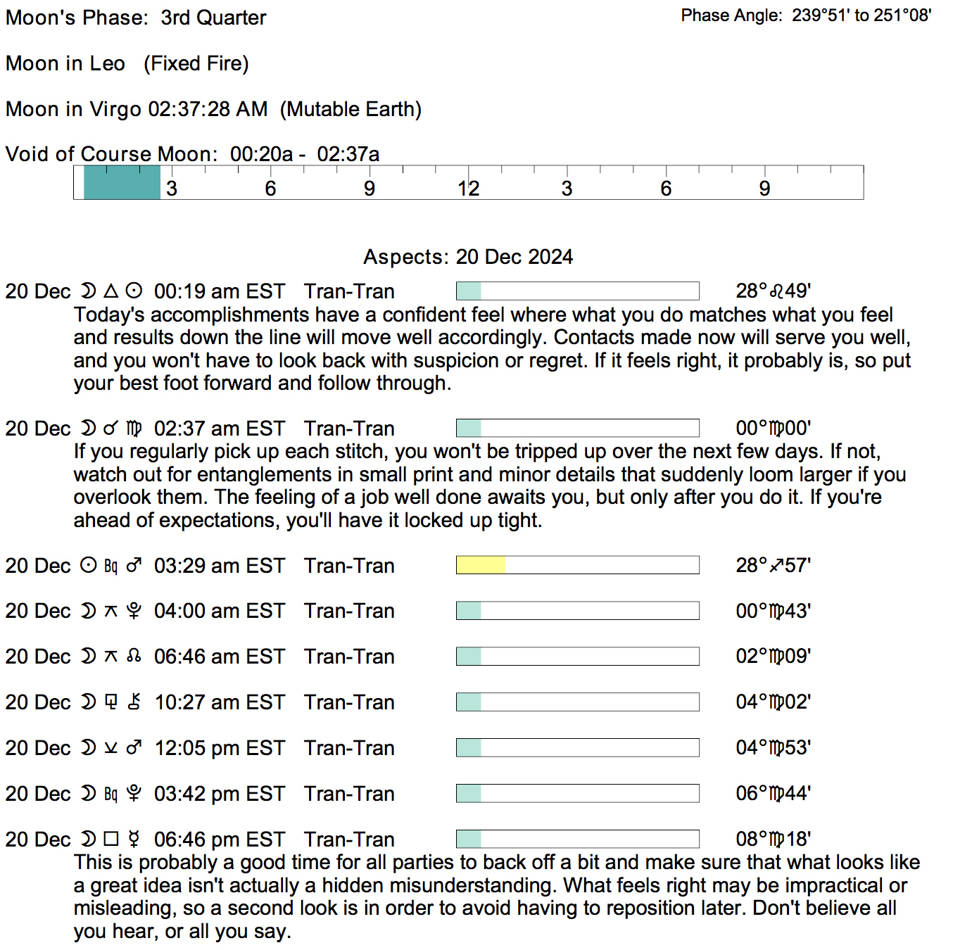 - A void Moon period occurs from 12:19 AM to 2:36 AM today.