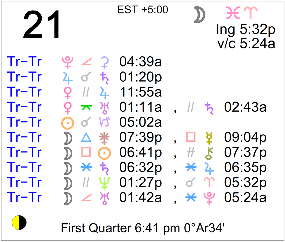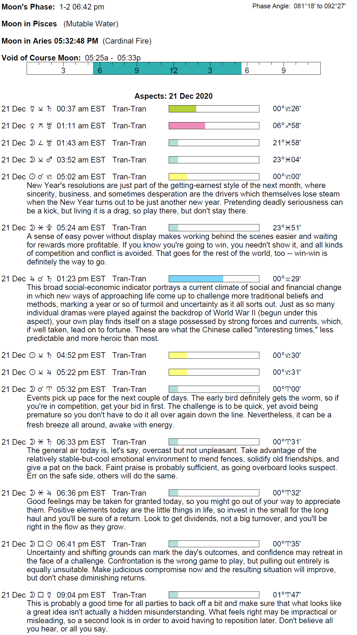 Planet Color Key: The longer the bar, the slower the aspecting planet, and the longer the duration of the planet’s transit.