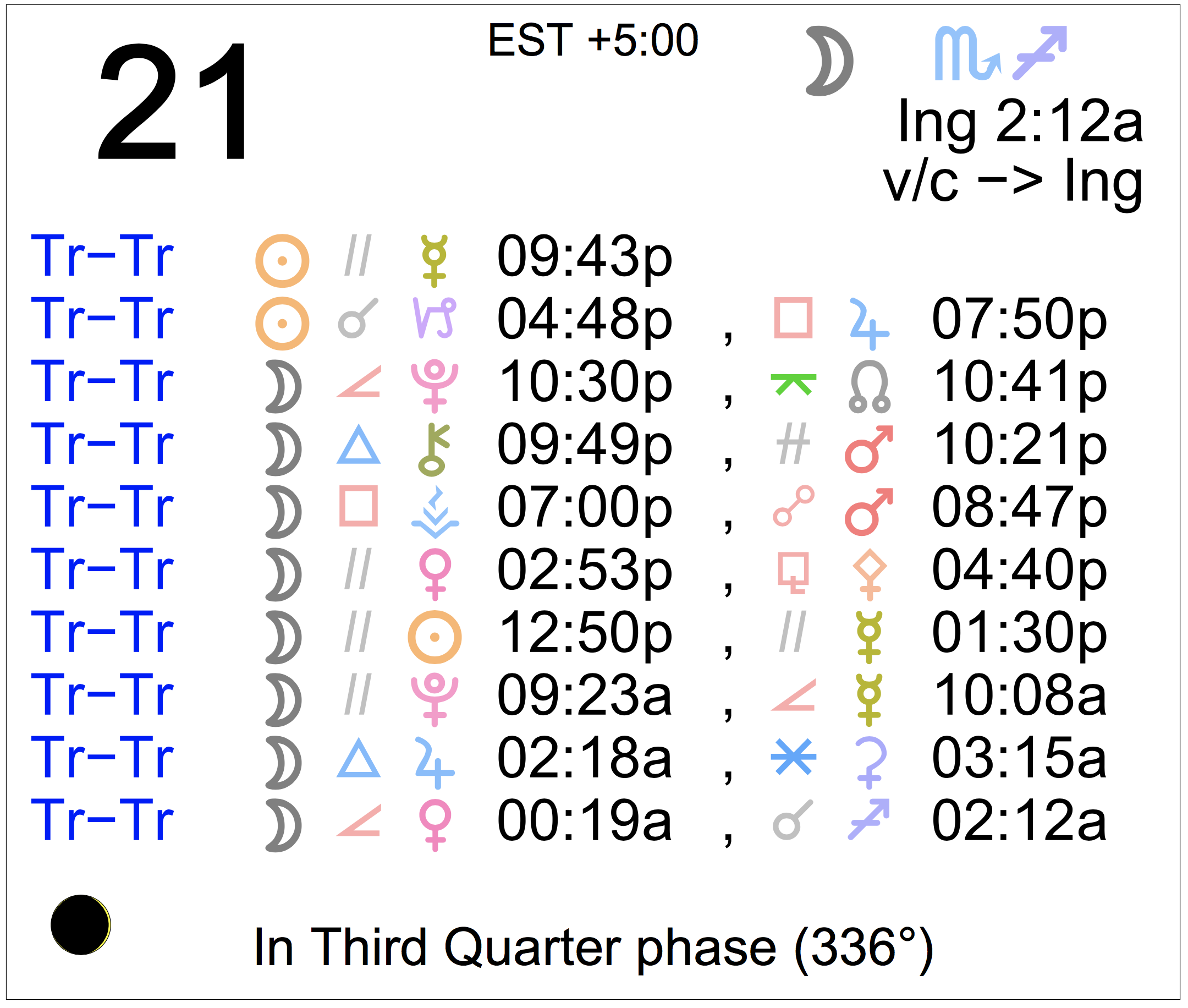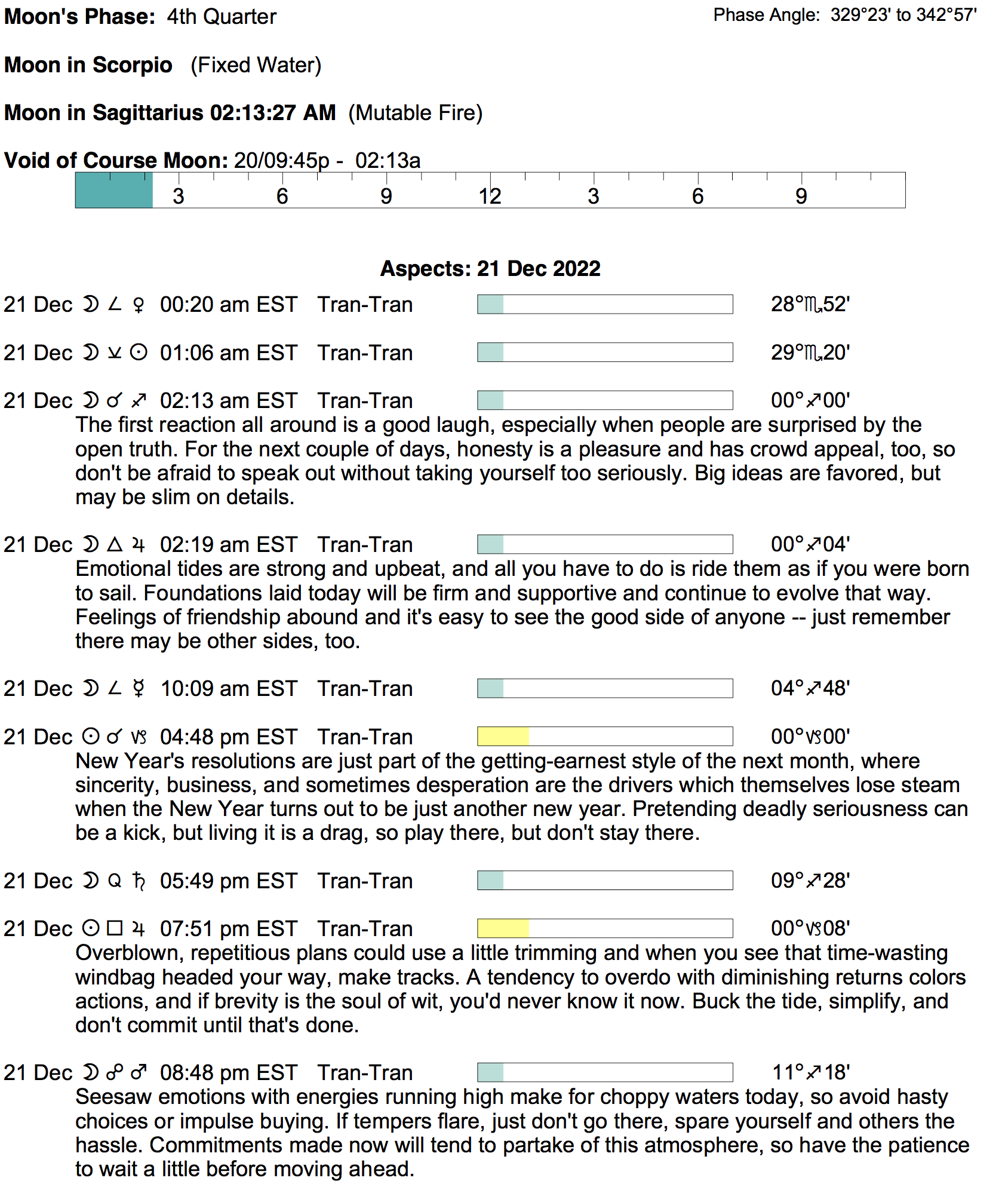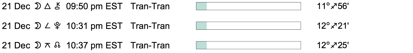Planet Color Key: The longer the bar, the slower the aspecting planet, and the longer the duration of the planet’s transit.