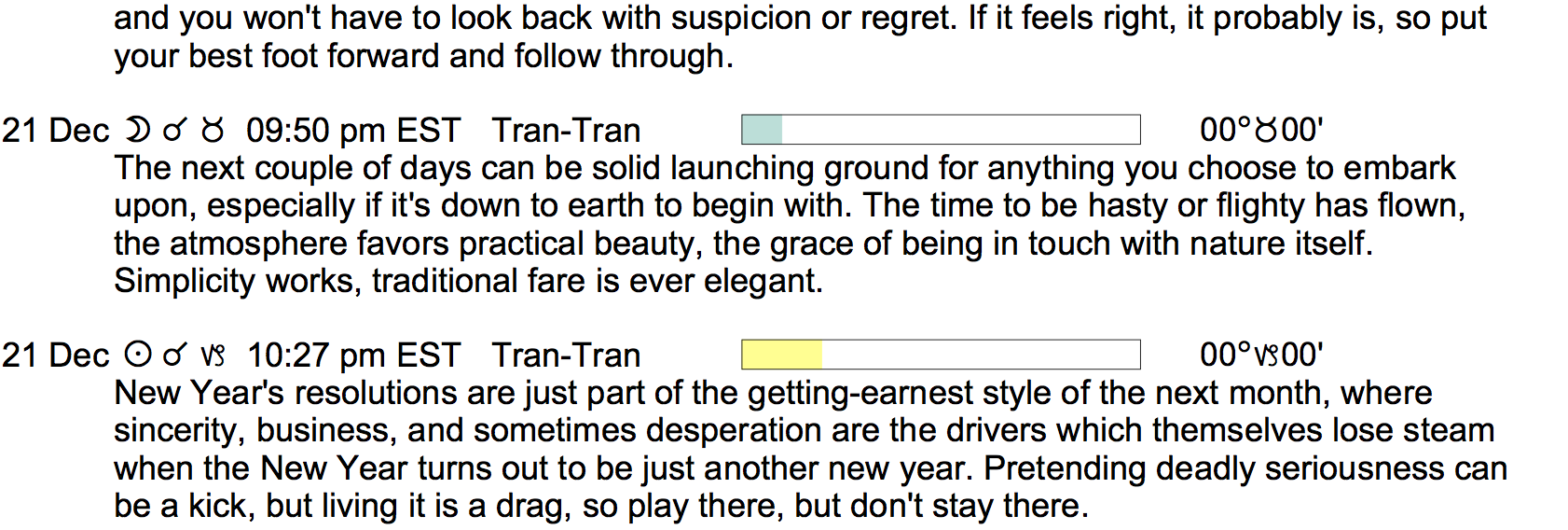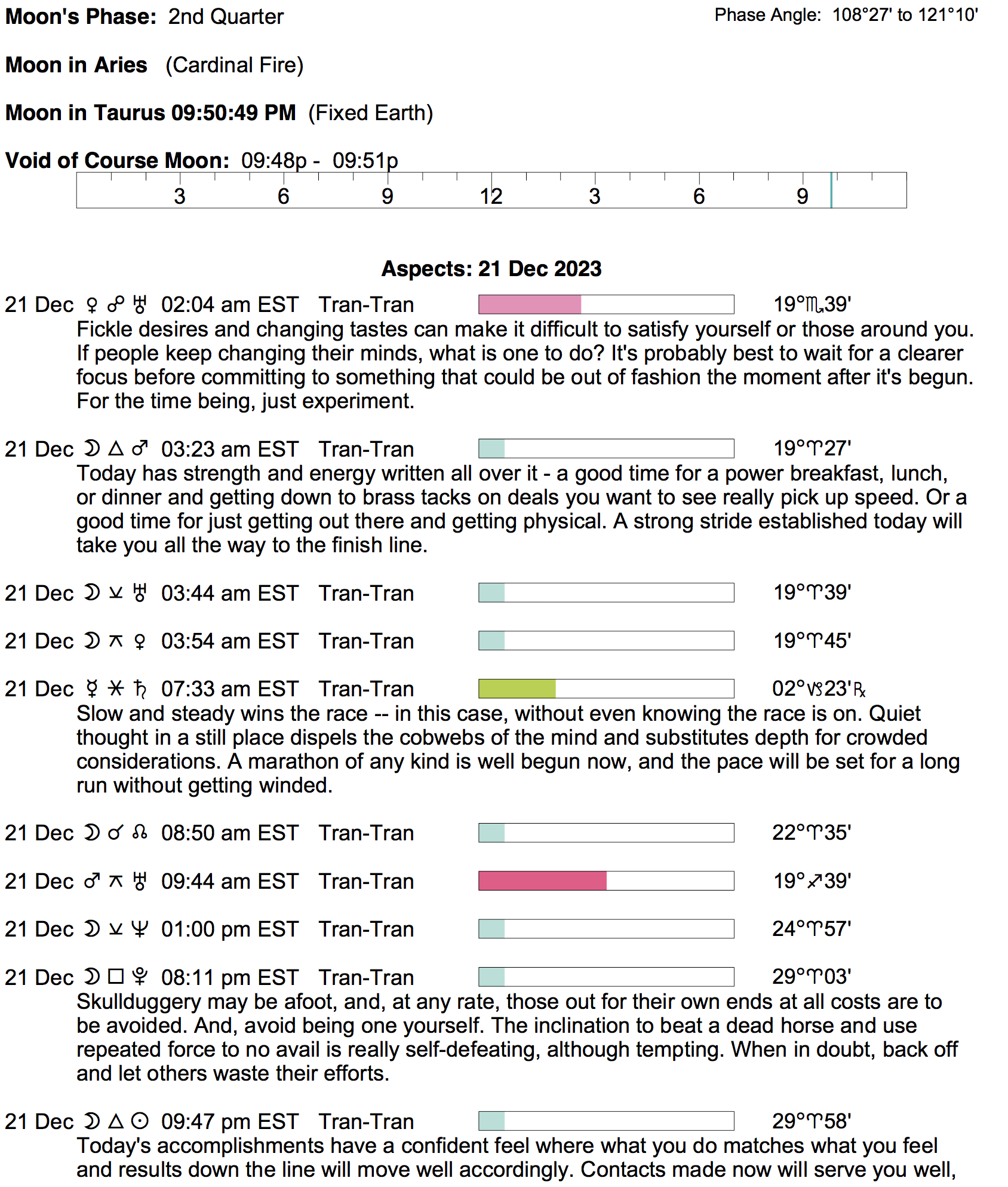 Planet Color Key: The longer the bar, the slower the aspecting planet, and the longer the duration of the planet’s transit.
