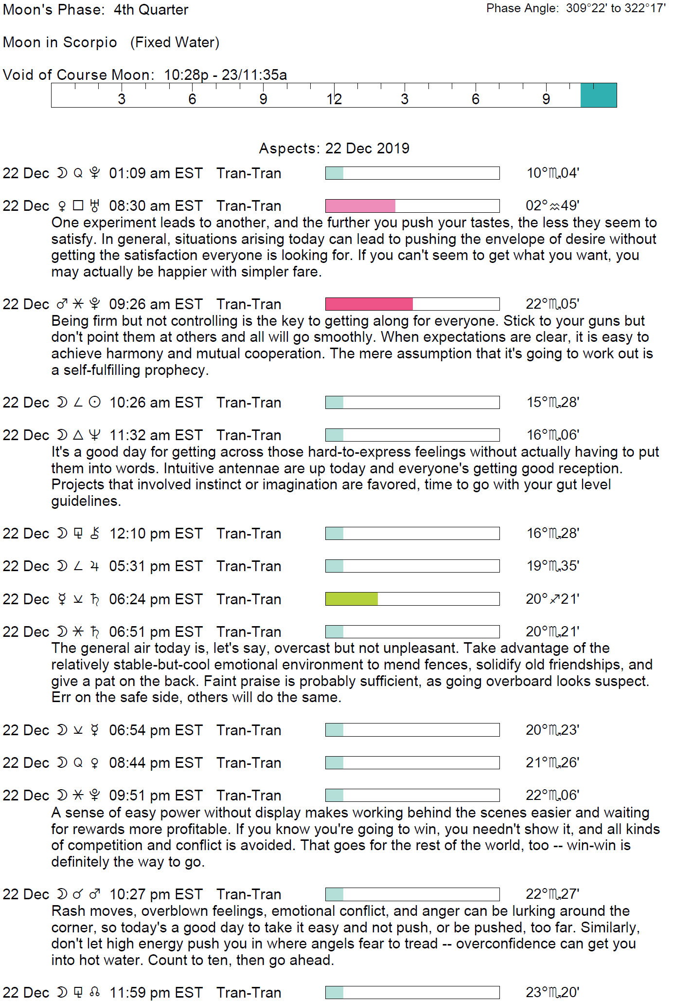Planet Color Key: The longer the bar, the slower the aspecting planet and the longer the duration of the planet’s transit.