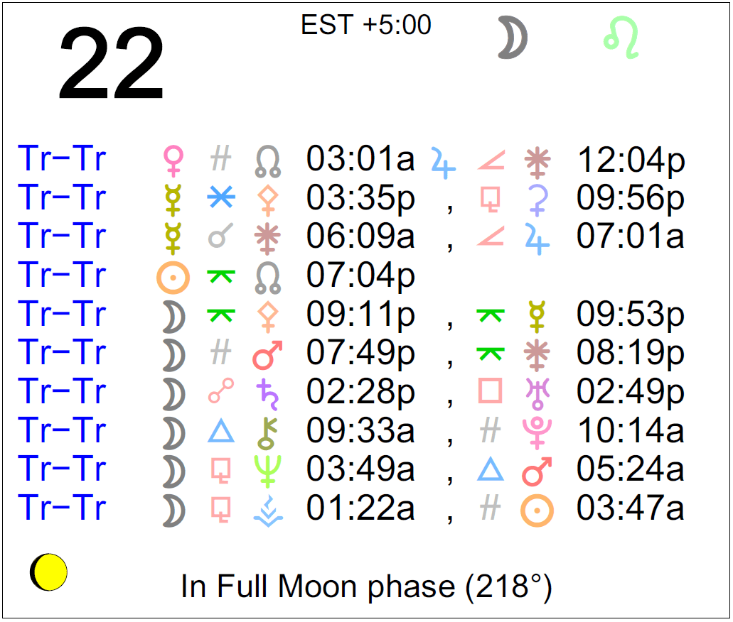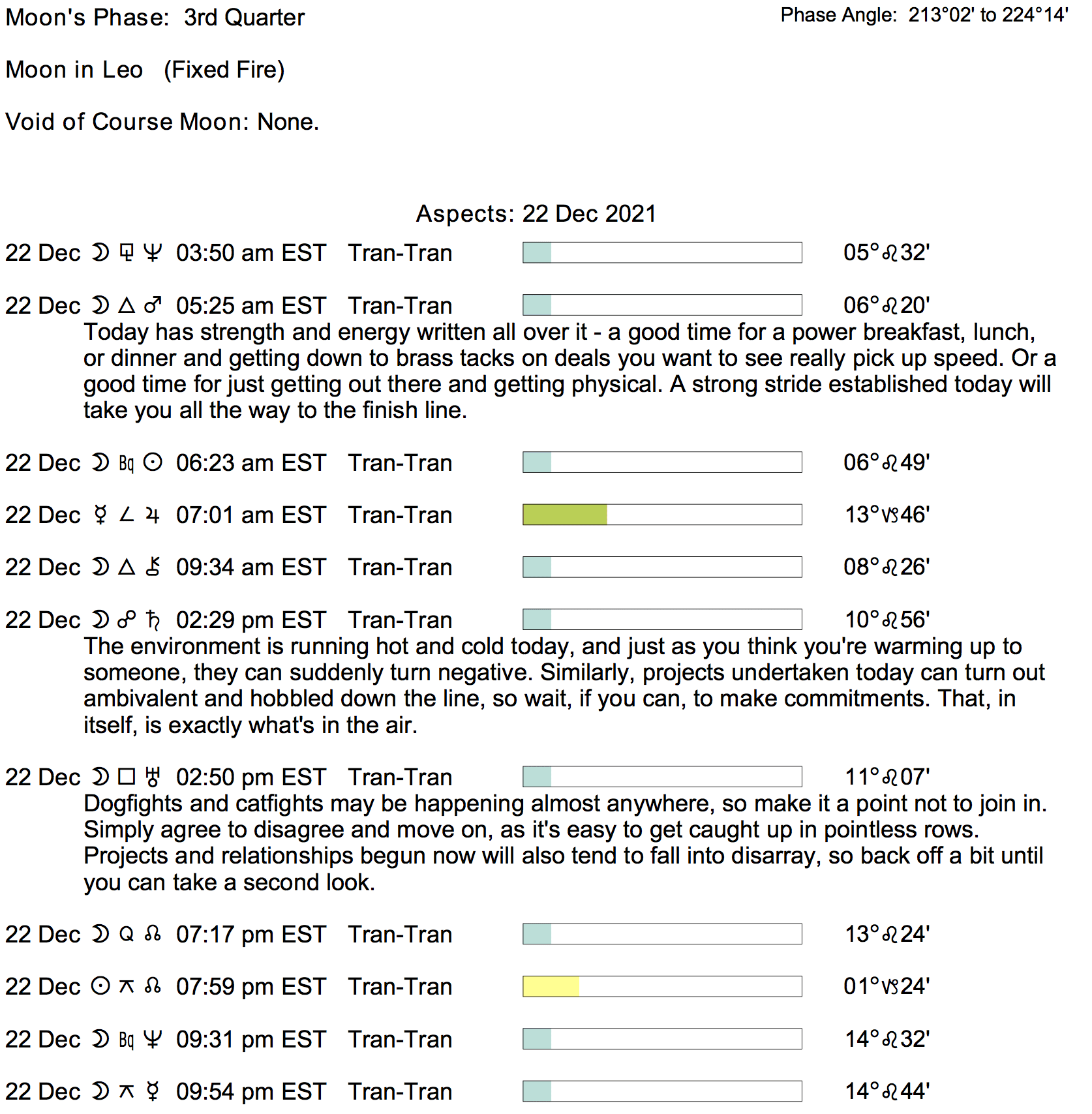 Planet Color Key: The longer the bar, the slower the aspecting planet, and the longer the duration of the planet’s transit.