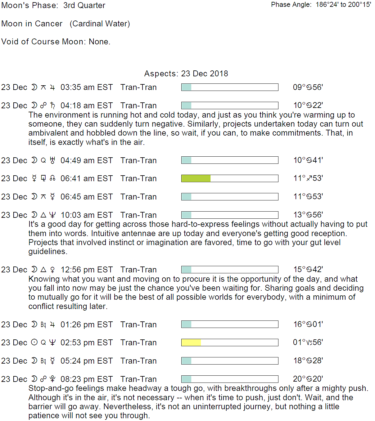 Planet Color Key: The longer the bar, the slower the aspecting planet and the longer the duration of the planet’s transit.