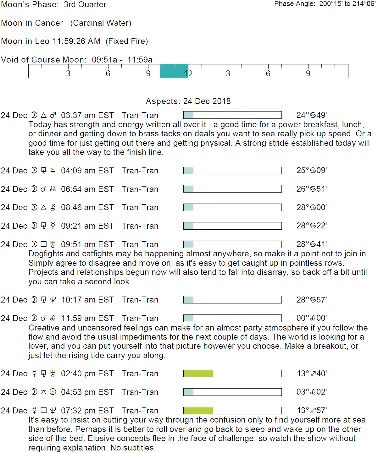 Planet Color Key: The longer the bar, the slower the aspecting planet and the longer the duration of the planet’s transit.