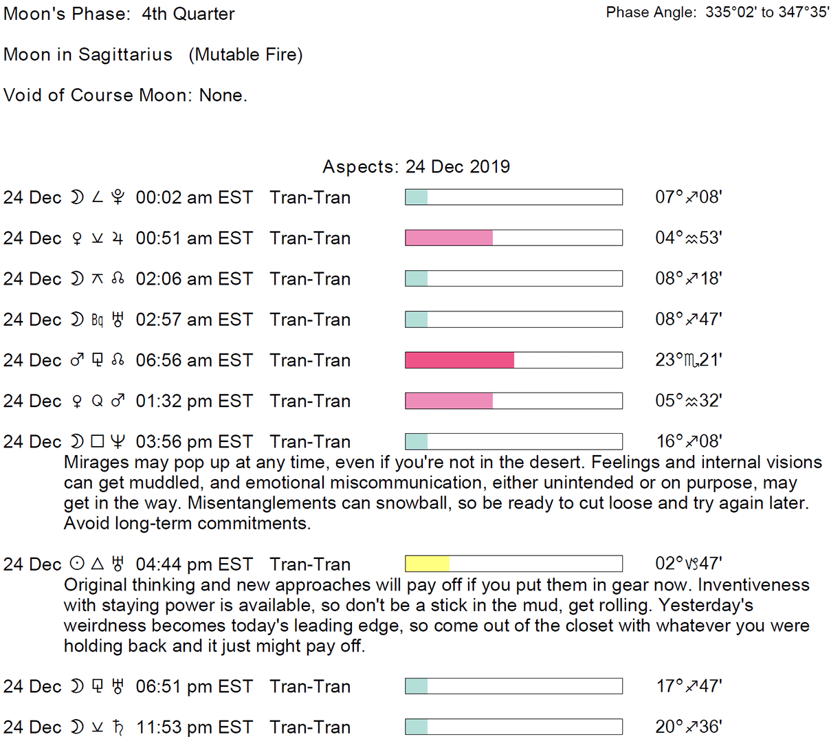 Planet Color Key: The longer the bar, the slower the aspecting planet and the longer the duration of the planet’s transit.