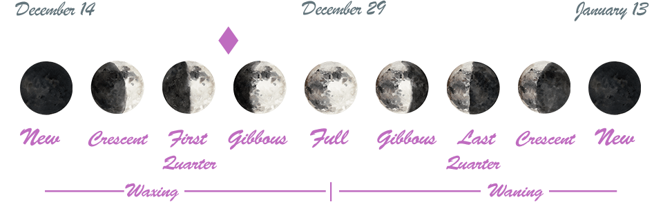 - We’re between the First Quarter Moon that occurred on the 21st and the Full Moon that will happen on December 29th.