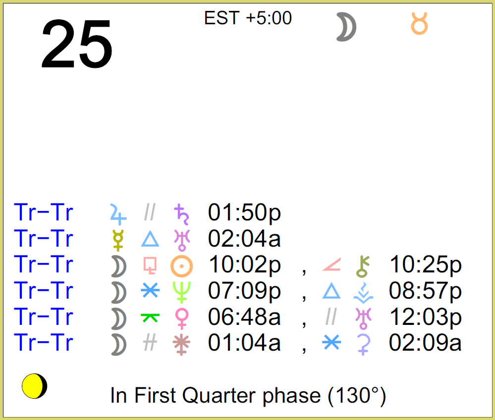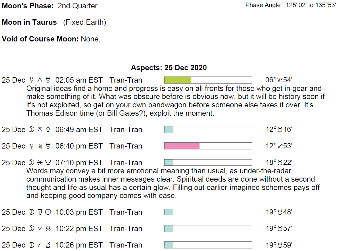 Planet Color Key: The longer the bar, the slower the aspecting planet, and the longer the duration of the planet’s transit.