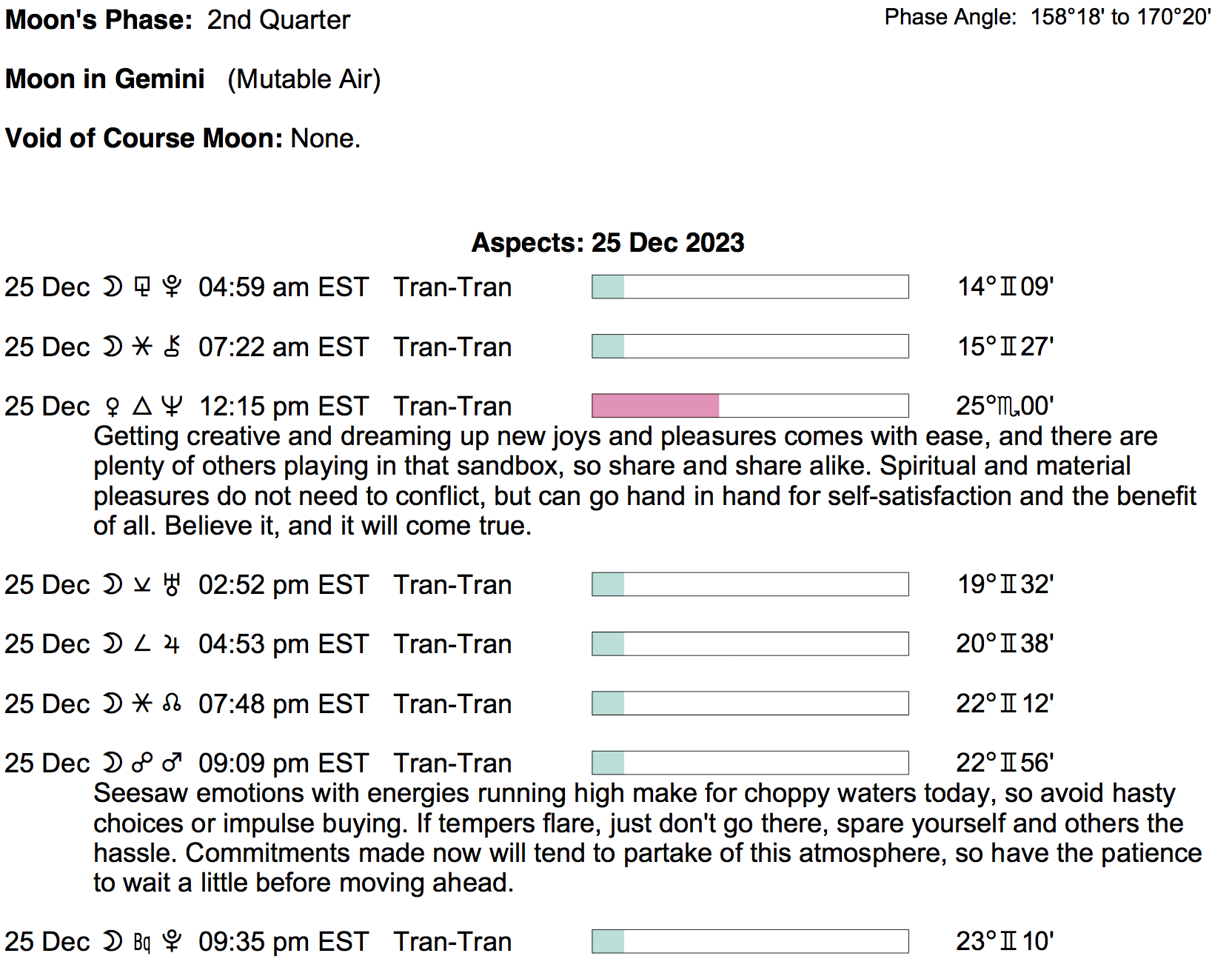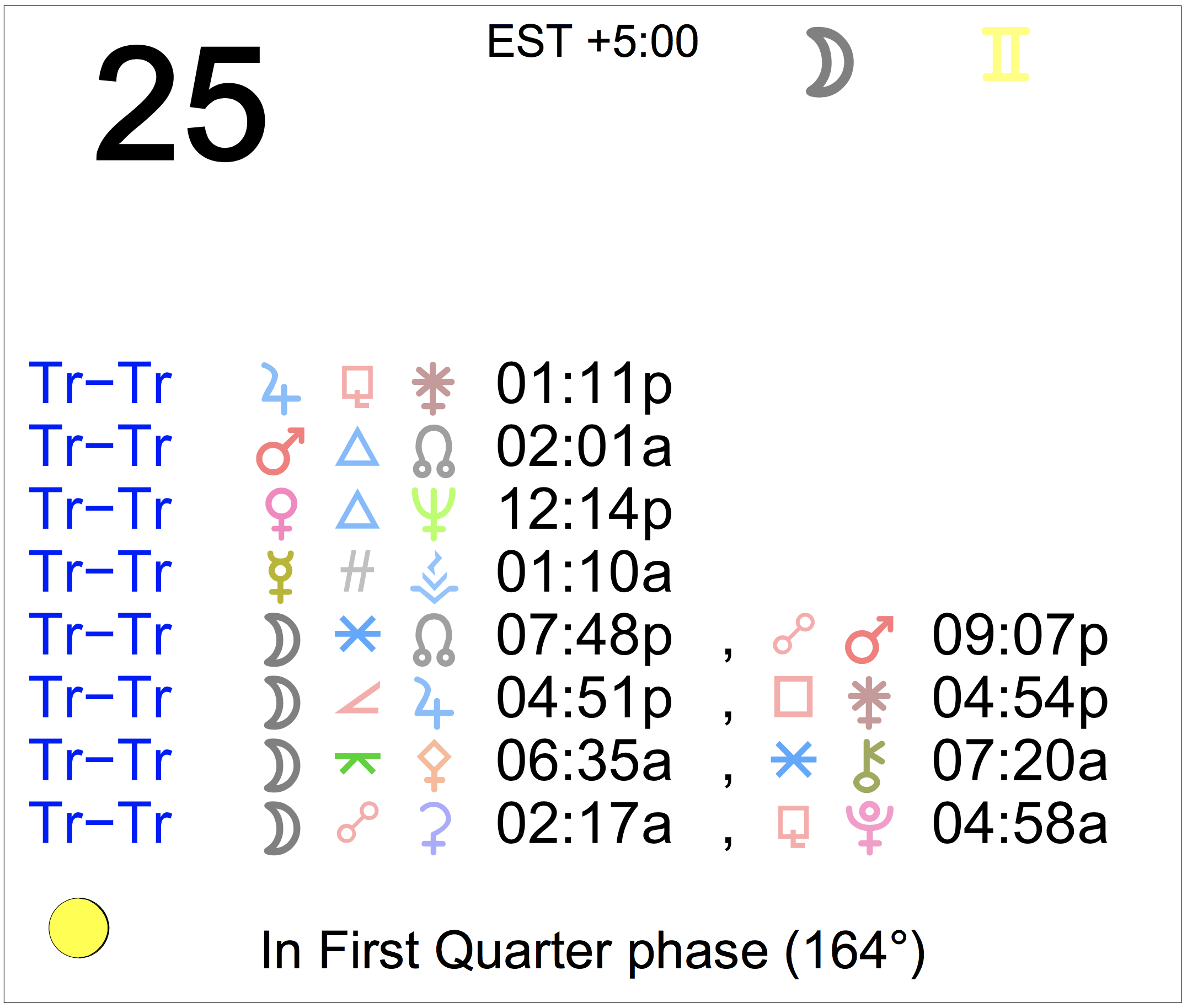 Planet Color Key: The longer the bar, the slower the aspecting planet, and the longer the duration of the planet’s transit.