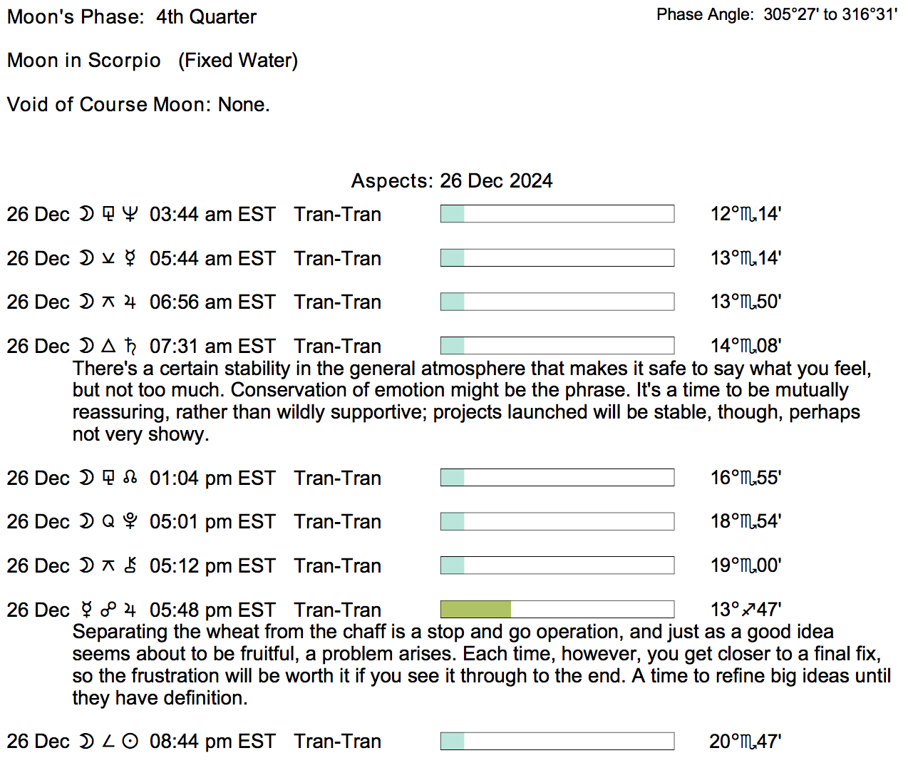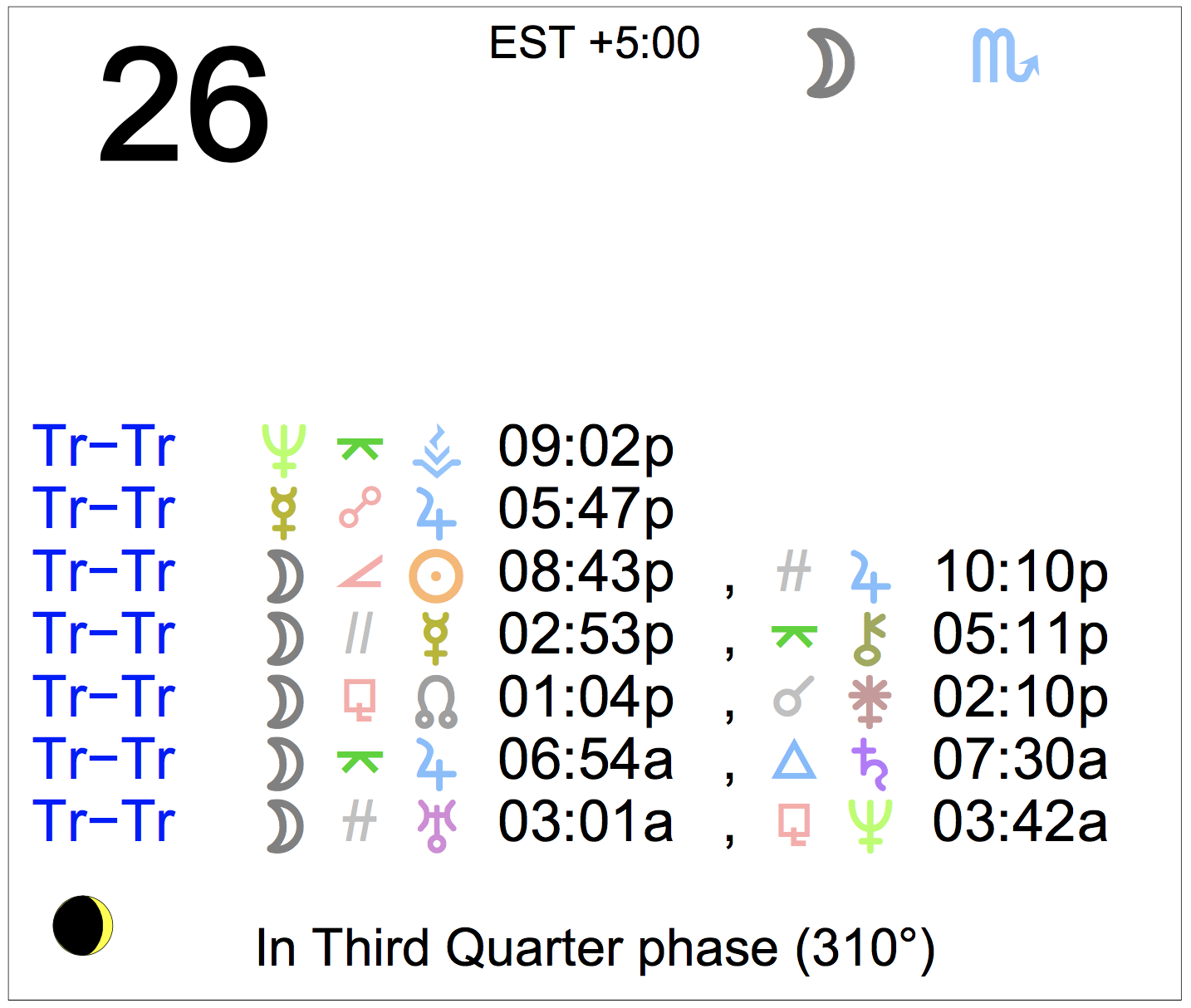 Planet Color Key: The longer the bar, the slower the aspecting planet, and the longer the duration of the planet’s transit.
