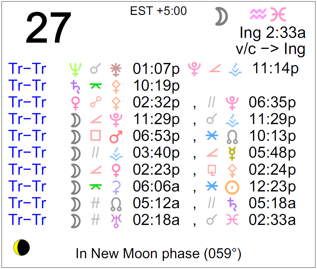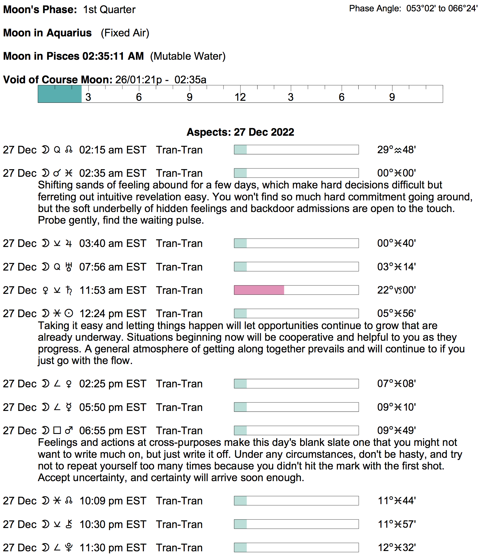 Planet Color Key: The longer the bar, the slower the aspecting planet, and the longer the duration of the planet’s transit.