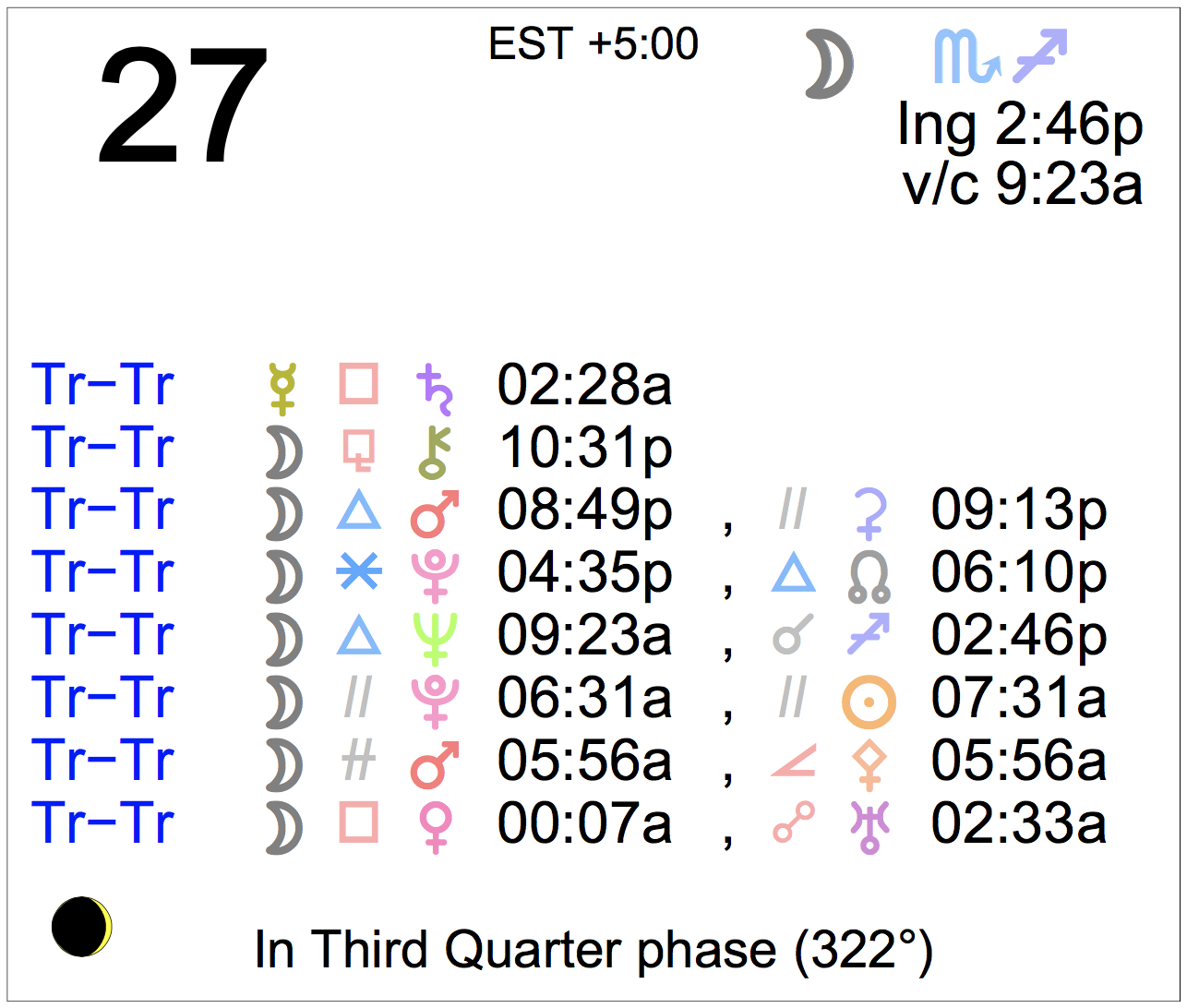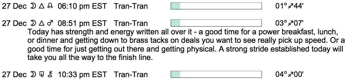 Planet Color Key: The longer the bar, the slower the aspecting planet, and the longer the duration of the planet’s transit.