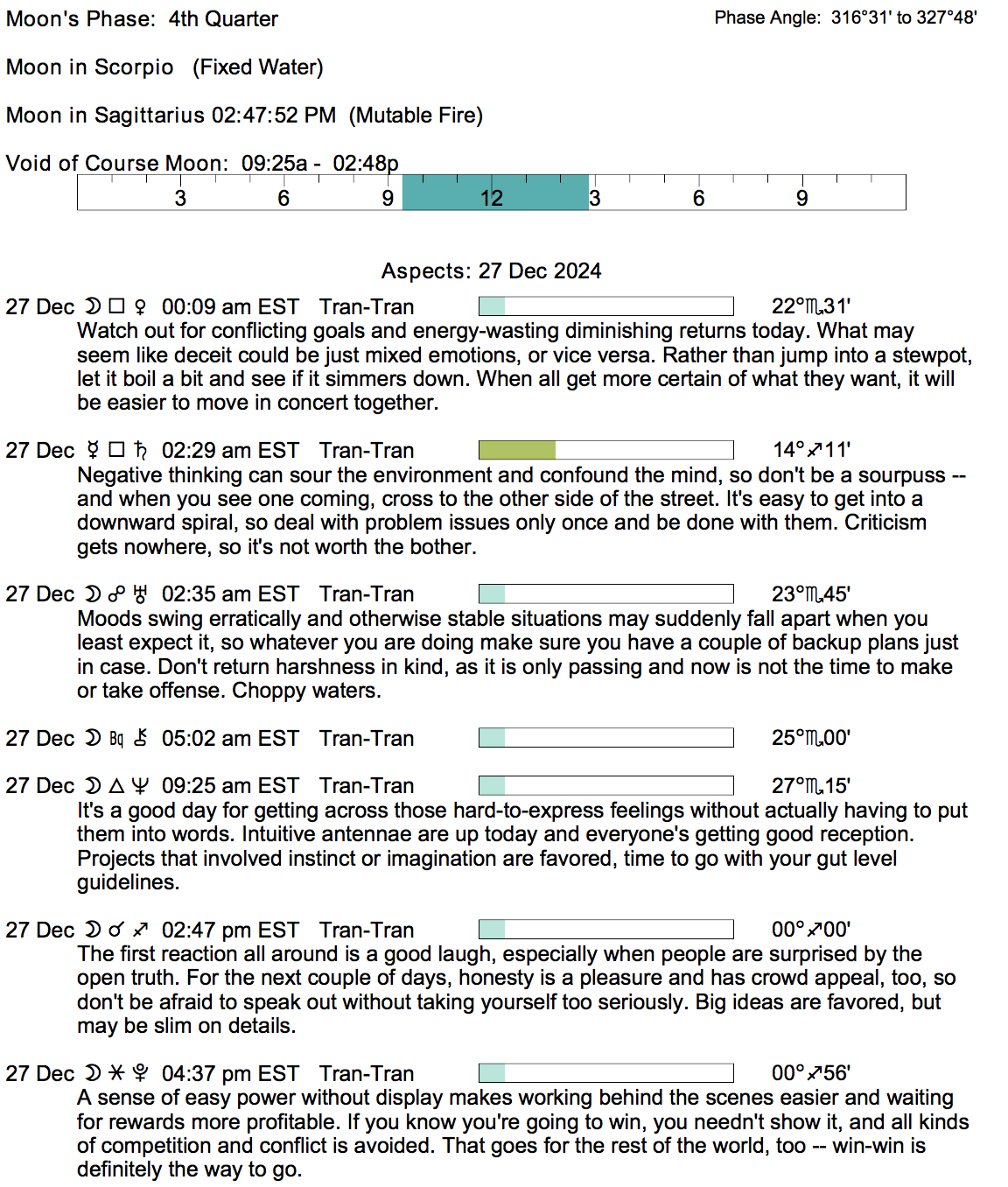 - The Last/Third Quarter Moon occurred on the 22nd, and the New Moon will happen on December 30th in the sign of Capricorn.