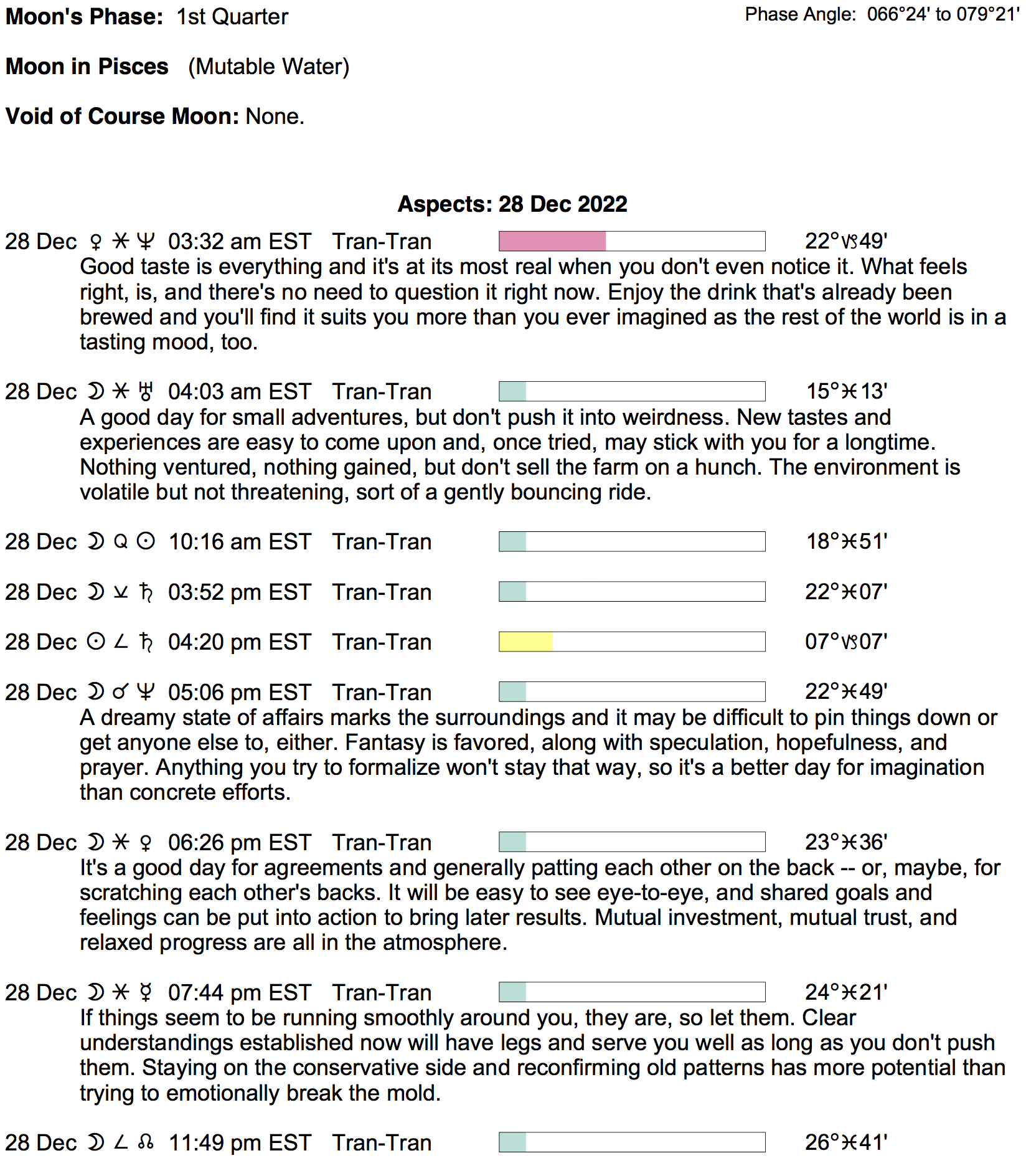 Planet Color Key: The longer the bar, the slower the aspecting planet, and the longer the duration of the planet’s transit.