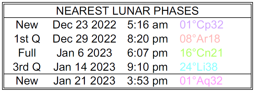 - The New Moon occurred in the sign of Capricorn on the 23rd, and the First Quarter Moon will happen on the 29th.