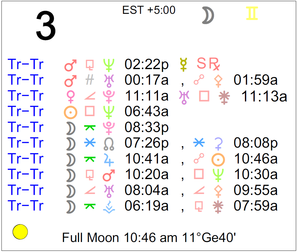 - The Full Moon occurs today in the sign of Gemini at 10:46 AM.