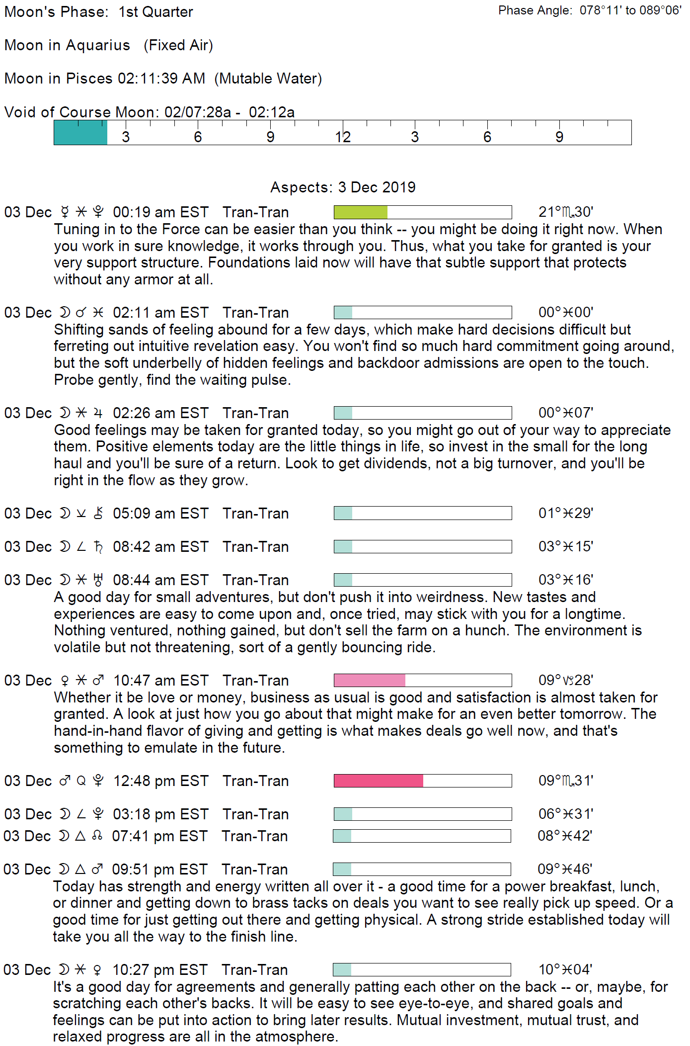 Planet Color Key: The longer the bar, the slower the aspecting planet and the longer the duration of the planet’s transit.
