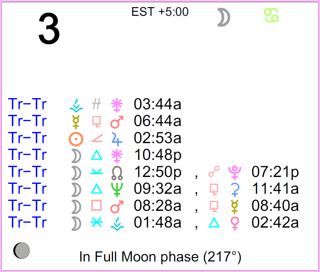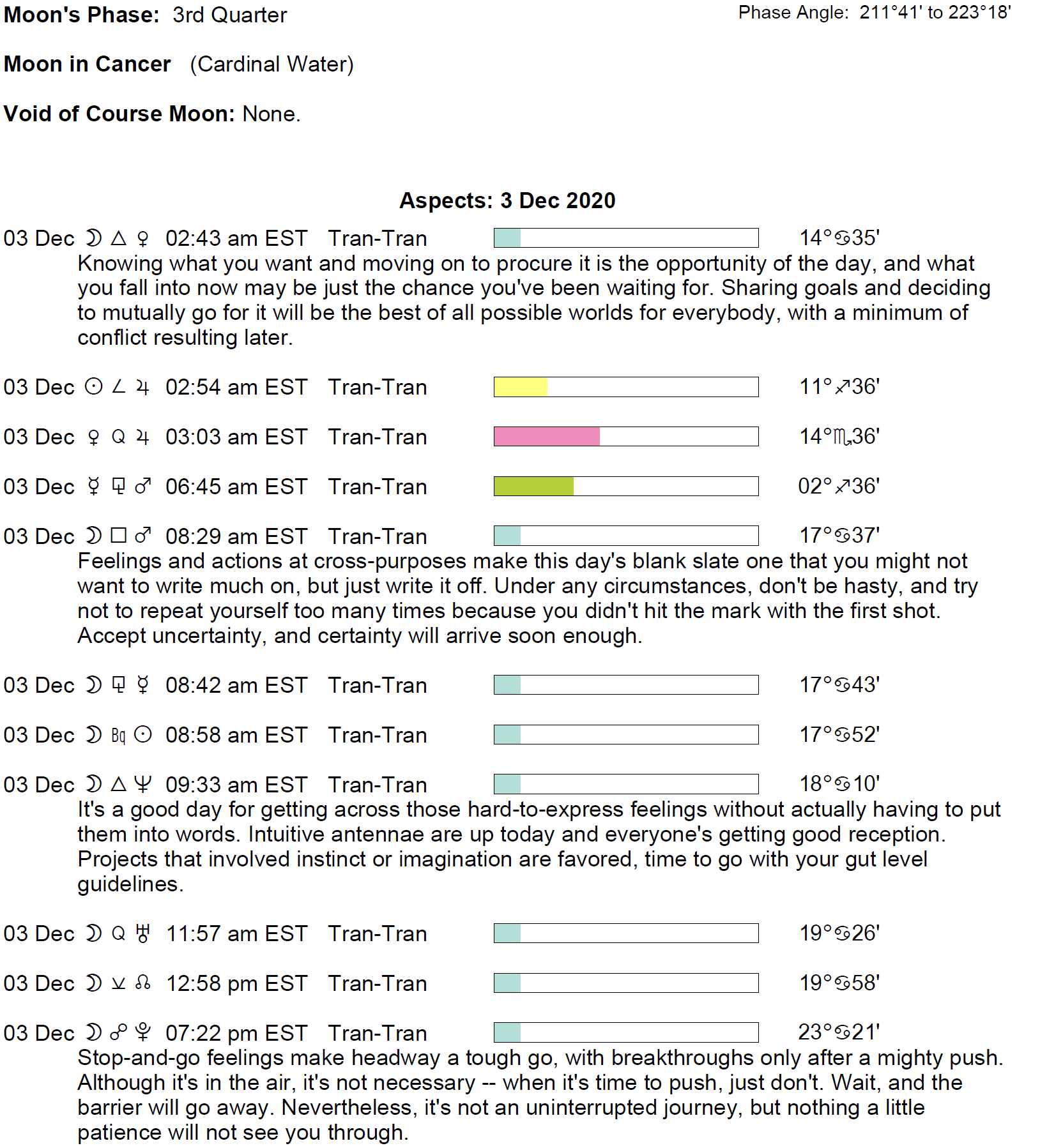 Planet Color Key: The longer the bar, the slower the aspecting planet, and the longer the duration of the planet’s transit.