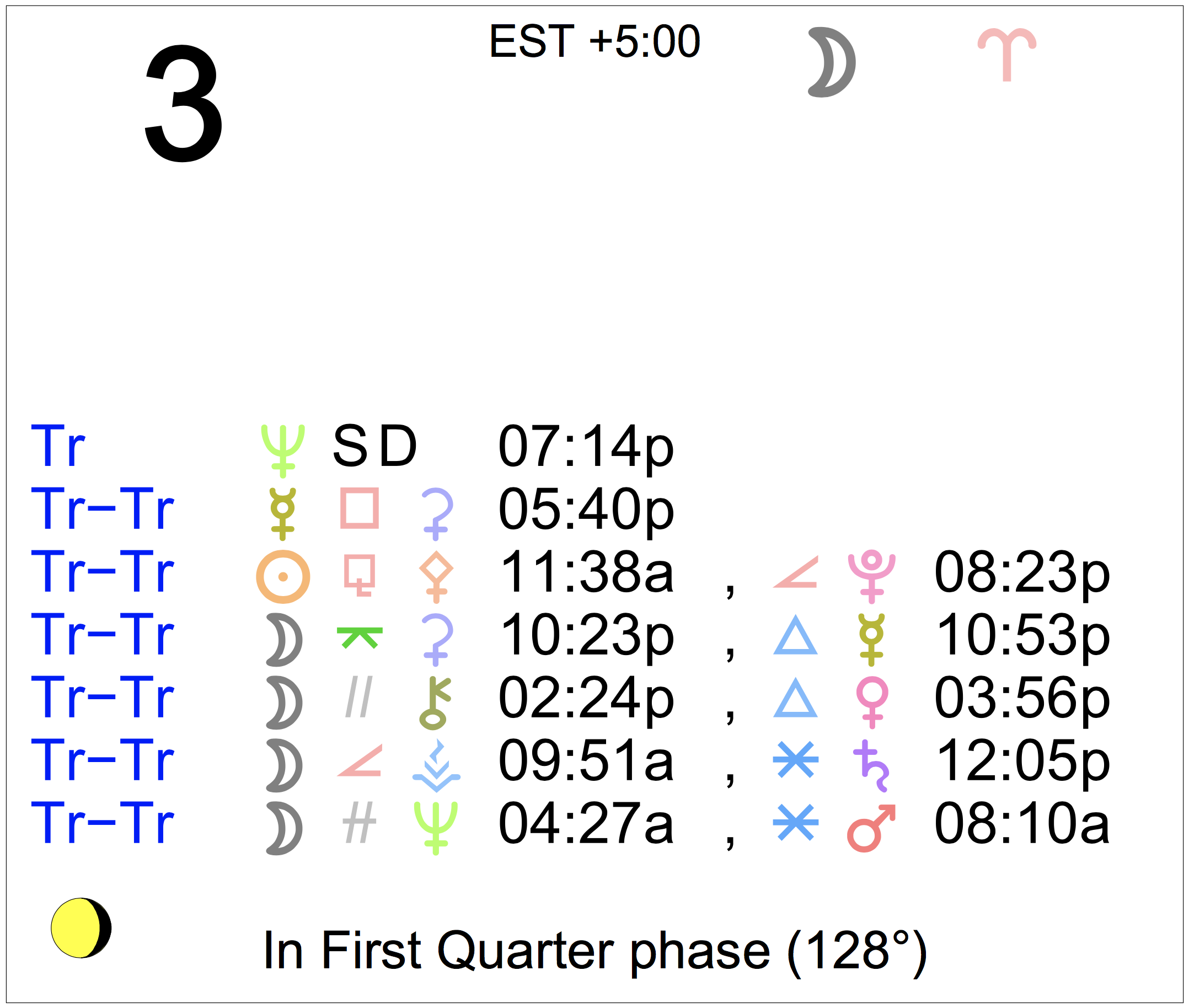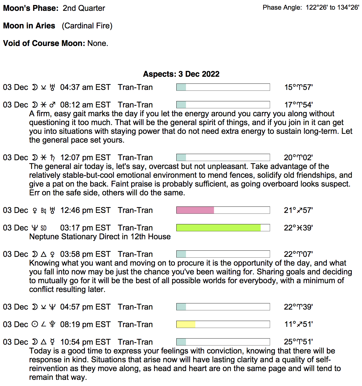 Planet Color Key: The longer the bar, the slower the aspecting planet, and the longer the duration of the planet’s transit.