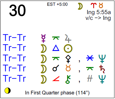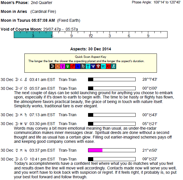 The following aspects (major only) and positions are at noon (EST) on December 30th: