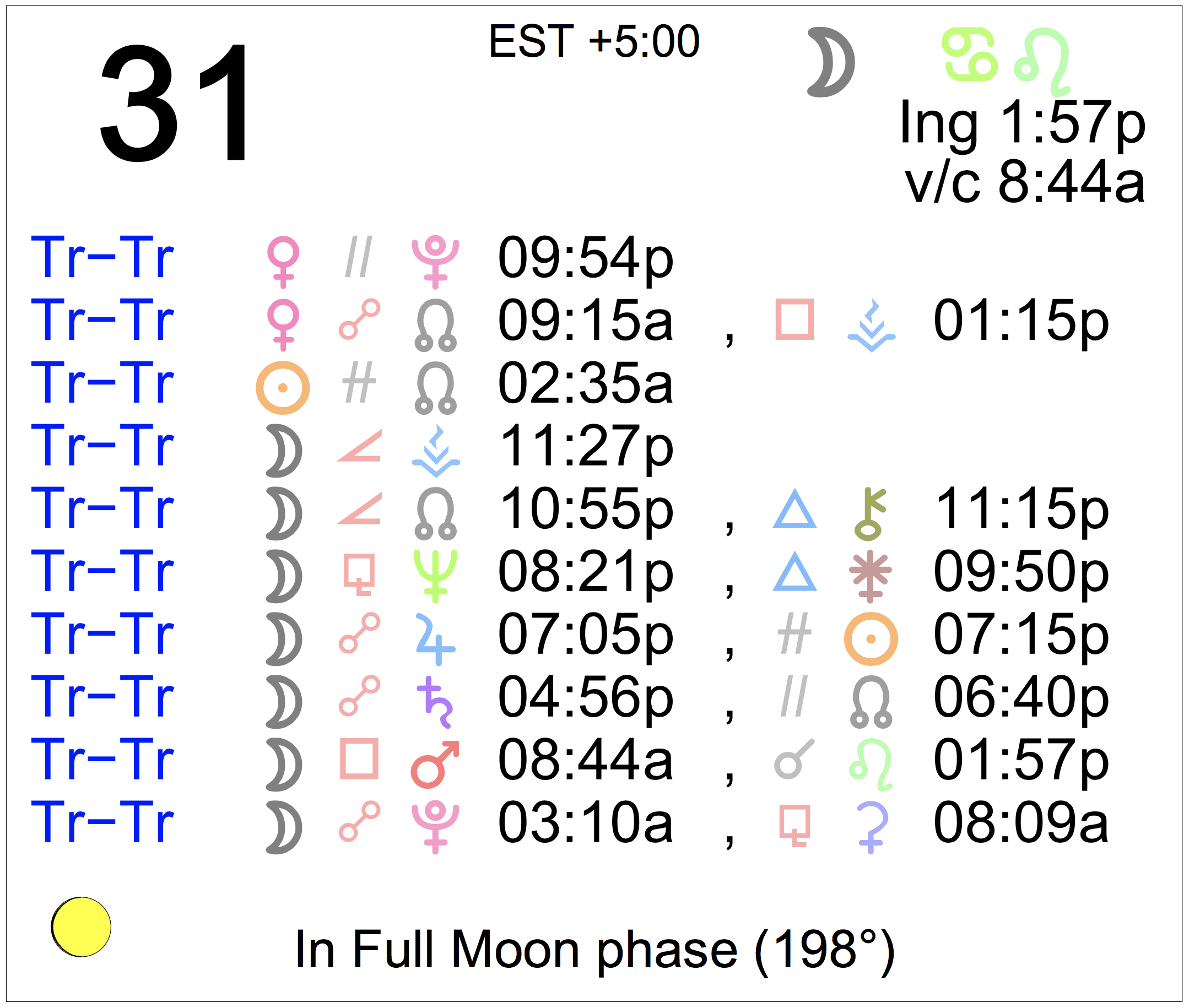 Planet Color Key: The longer the bar, the slower the aspecting planet, and the longer the duration of the planet’s transit.