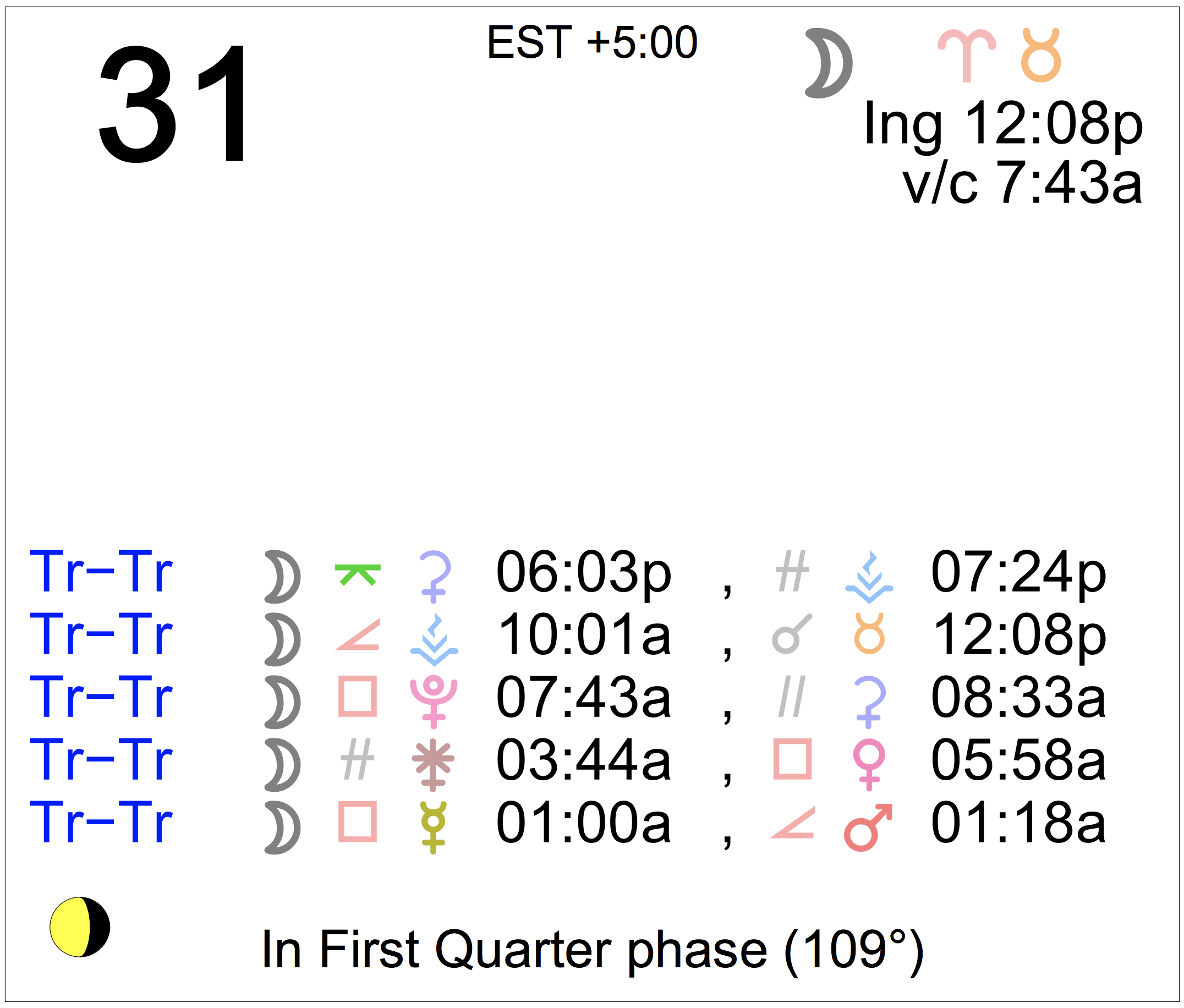 - The Moon is in Aries until 12:08 PM after which the Moon is in Taurus.