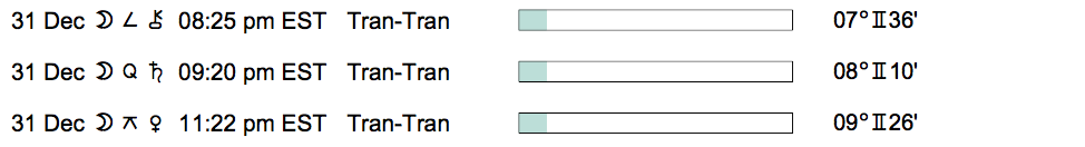 Planet Color Key: The longer the bar, the slower the aspecting planet, and the longer the duration of the planet’s transit.