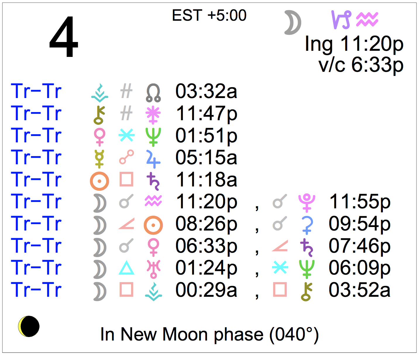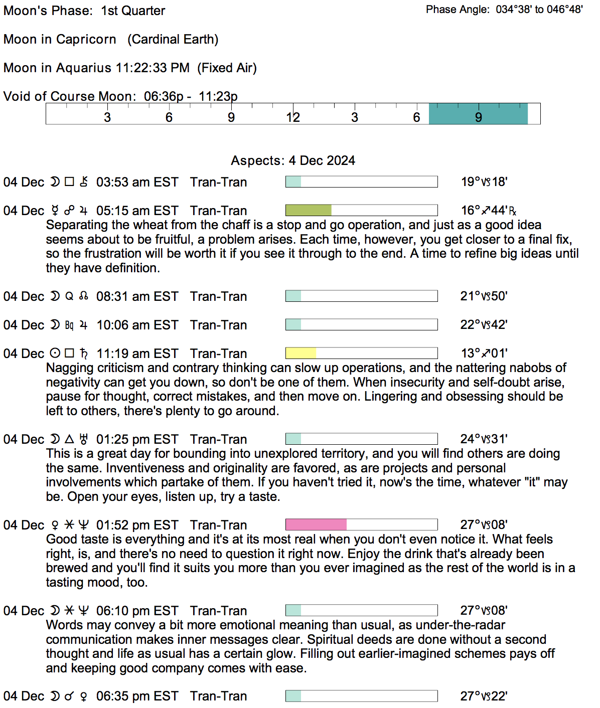 Planet Color Key: The longer the bar, the slower the aspecting planet, and the longer the duration of the planet’s transit.