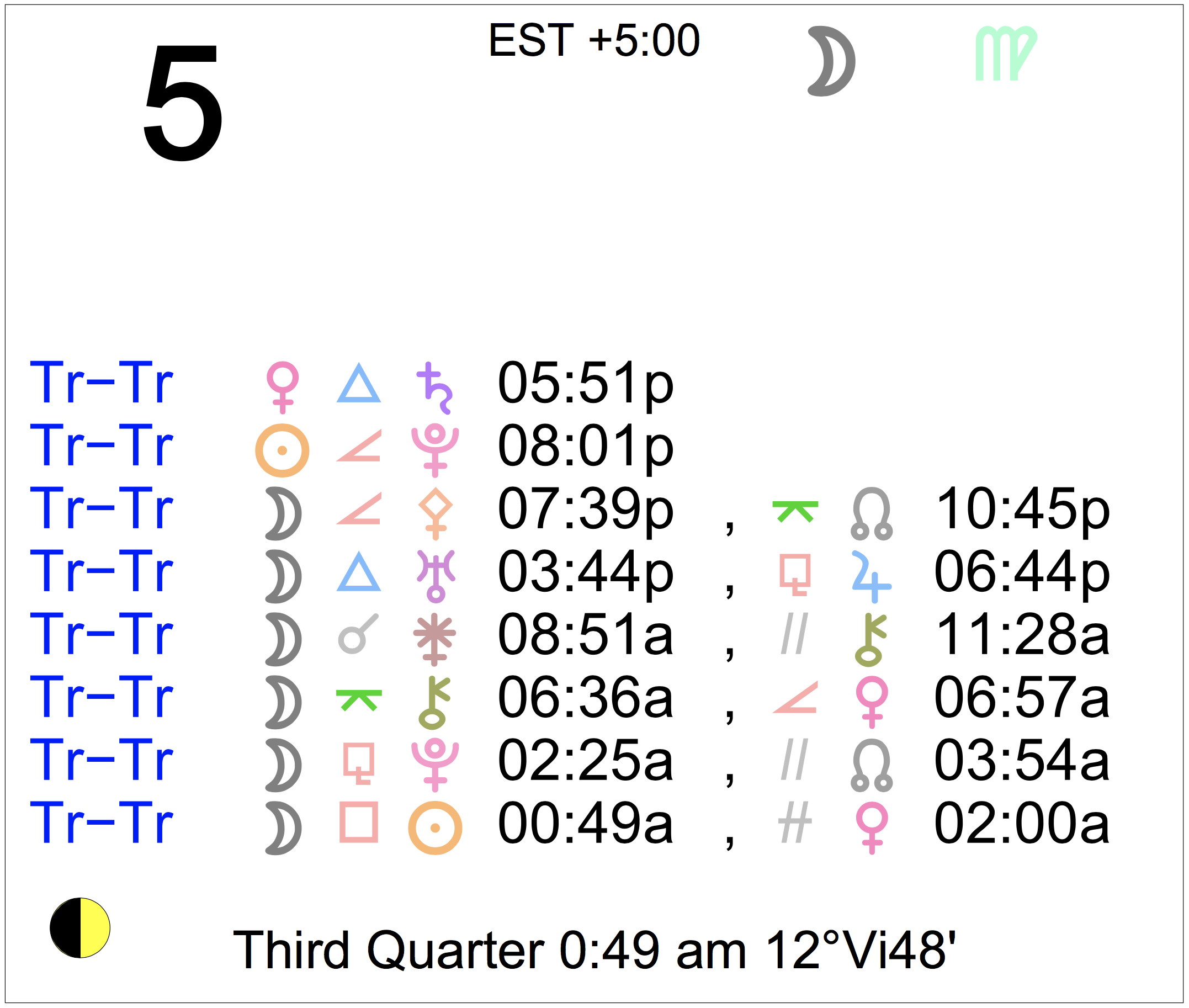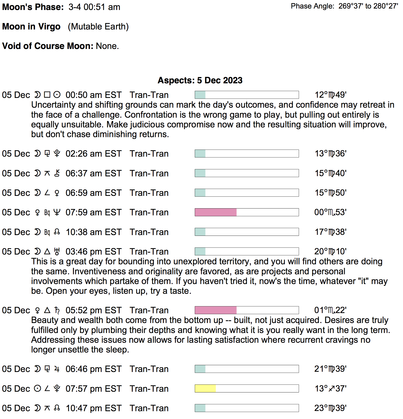 Planet Color Key: The longer the bar, the slower the aspecting planet, and the longer the duration of the planet’s transit.