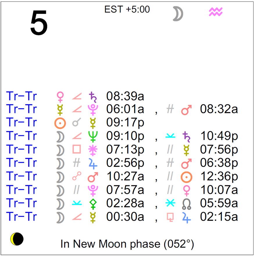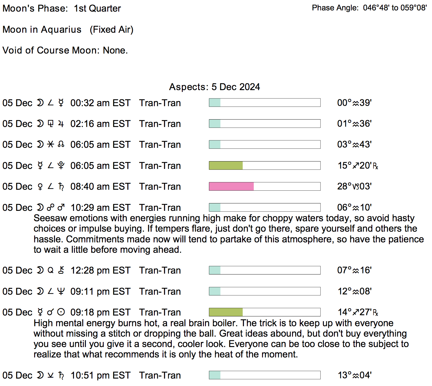 Planet Color Key: The longer the bar, the slower the aspecting planet, and the longer the duration of the planet’s transit.