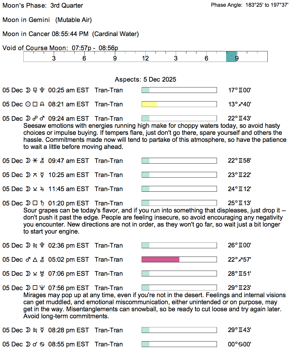 Planet Color Key: The longer the bar, the slower the aspecting planet, and the longer the duration of the planet’s transit.