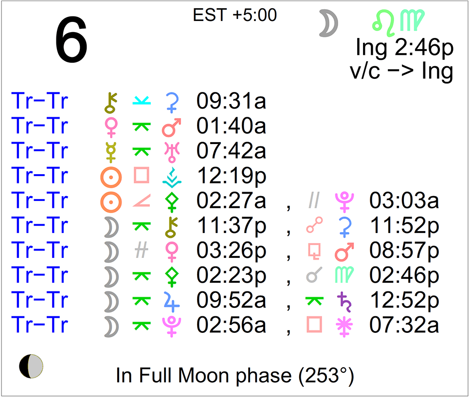 - A void Moon continues until 2:46 PM today (since yesterday at 5:27 PM).