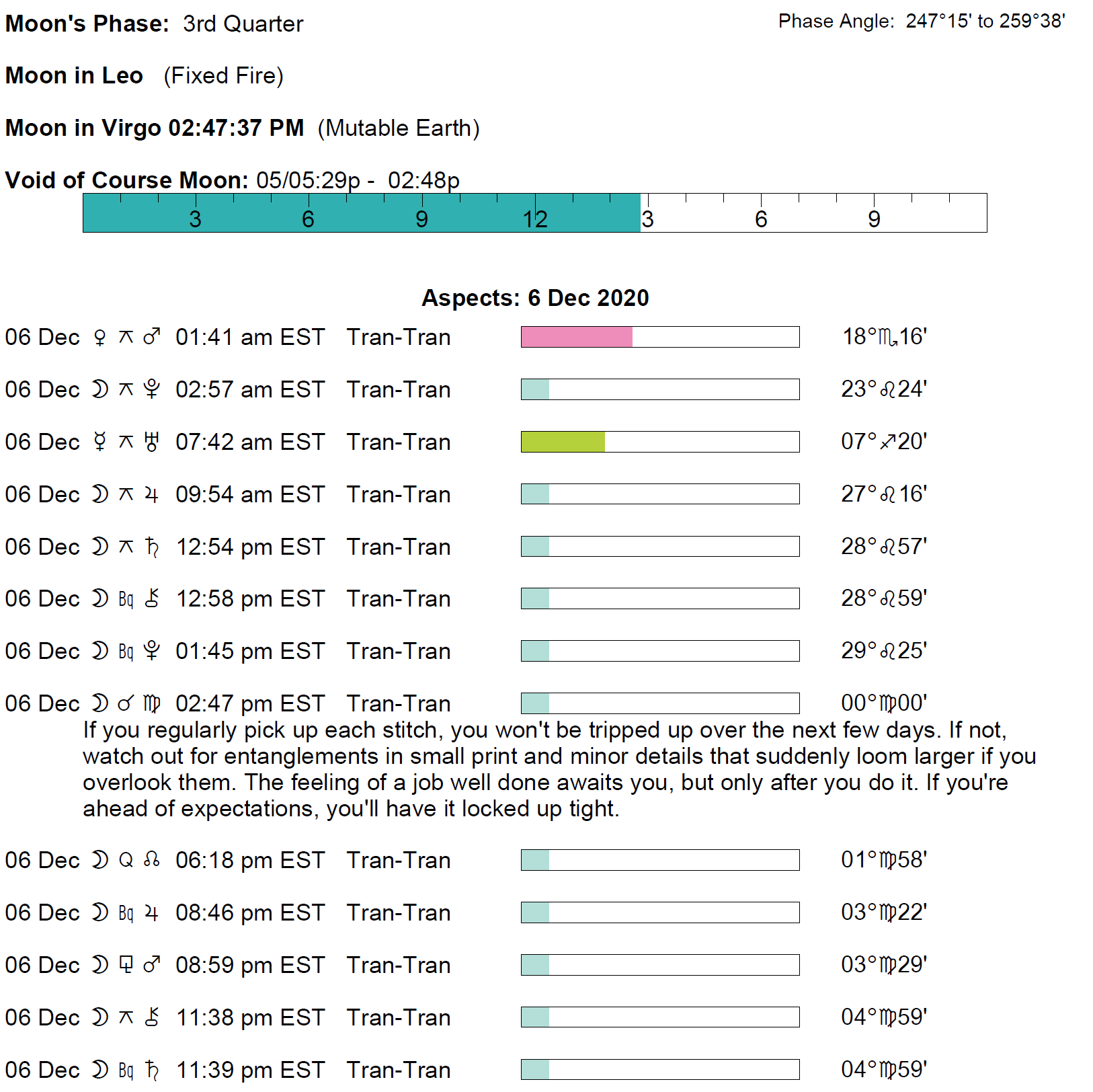 Planet Color Key: The longer the bar, the slower the aspecting planet, and the longer the duration of the planet’s transit.