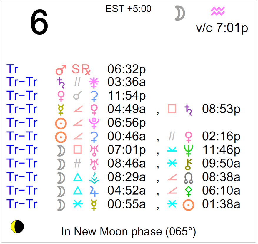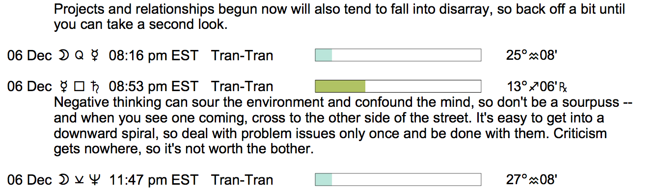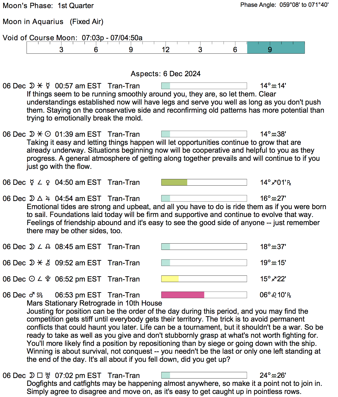 Planet Color Key: The longer the bar, the slower the aspecting planet, and the longer the duration of the planet’s transit.