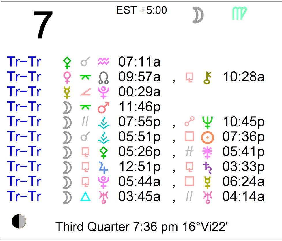 Planet Color Key: The longer the bar, the slower the aspecting planet, and the longer the duration of the planet’s transit.