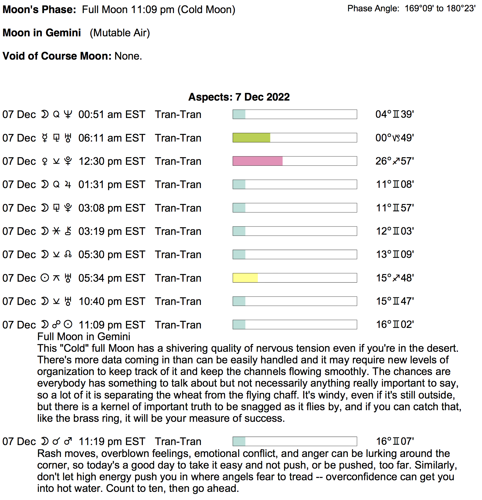 Planet Color Key: The longer the bar, the slower the aspecting planet, and the longer the duration of the planet’s transit.