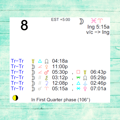The following aspects (major only) and positions are at noon (EST) on December 8th:
